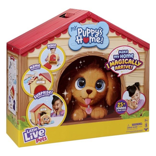 Little Live Pets - My Puppy's Home brings the joy of creativity and surprise to kids of all ages. This delightful set allows children to embark on an exciting journey of construction and discovery, culminating in the heartwarming surprise of welcoming an adorable pet puppy into their lives.The adventure begins with the flat-packed My Puppy's Home, equipped with all the necessary tools and components for building a charming puppy residence. As young builders assemble the walls and roof, anticipation builds for the furry friend that will soon call this house a home.Once the construction is complete, the magic truly begins. Laying out the welcome mat and filling the puppy's water bowl, children witness an enchanting transformation as cute paw prints appear on the mat. The next step is personalization, as kids add their chosen name to the kennel. And now, the grand moment arrives – opening the door to reveal the surprise guest, a lovable pet puppy, ready to be adored.With over 25 sounds and reactions, including a toy bone for added fun, the interactive experience never gets old. The magic of welcoming a new pet can be repeated again and again, providing hours of enchantment and companionship.Little Live Pets - My Puppy's Home is the perfect blend of creativity and companionship, offering children the chance to prepare a loving home for their new furry friend. This charming set fosters a sense of responsibility and endless fun, making it an ideal gift for kids of all ages. Prepare to be amazed as your child embarks on a heartwarming journey with their new pet puppy!