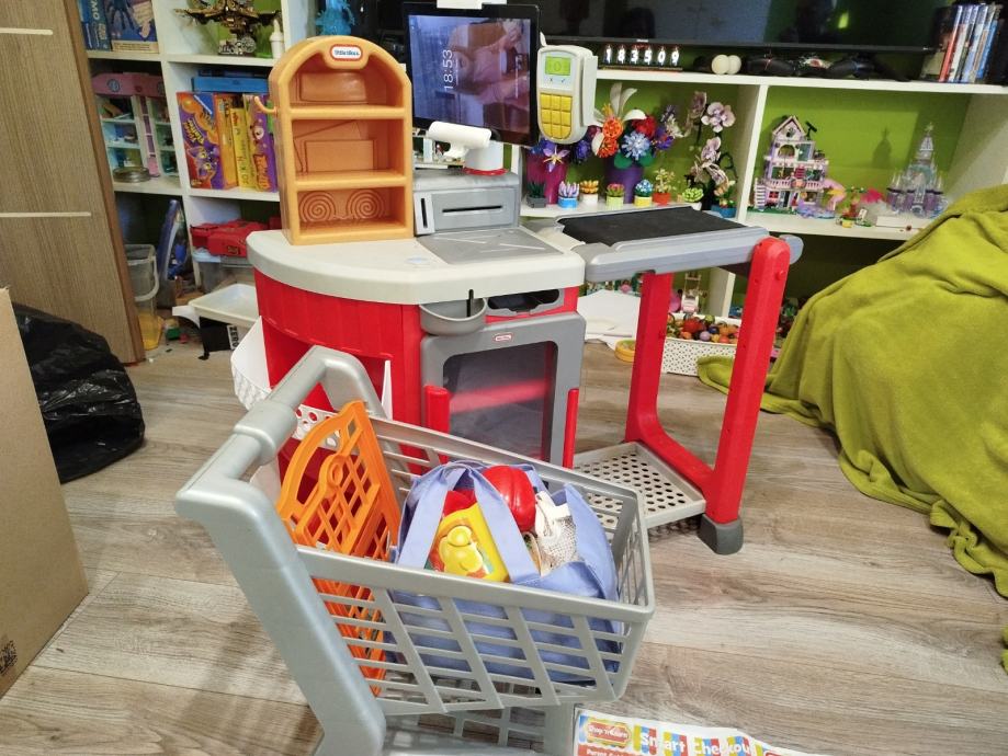 Prodajem veliku dječju trgovinu (kasa, traka, police) s puno dodataka za igru.