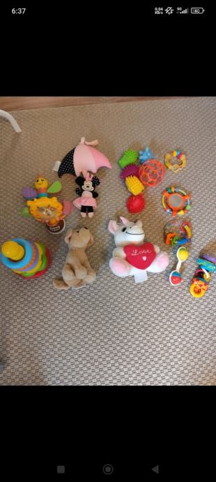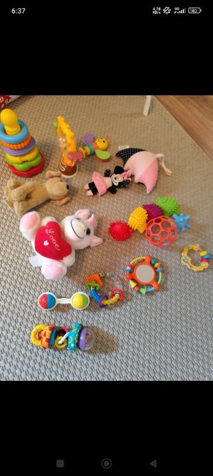 Prodajem lot dječjih igračaka, sve zajedno kao na fotografijama. U lotu se nalazi više komada raznih igračaka za najmlađe: plišane igračke (slon, pas i figurica Minnie Mouse), nekoliko zvečki i grizalica različitih oblika i boja, piramida s prstenovima, razne senzorske igračke s teksturama te ostale šarene igračke za bebe i malu djecu. Sve igračke su rabljene.