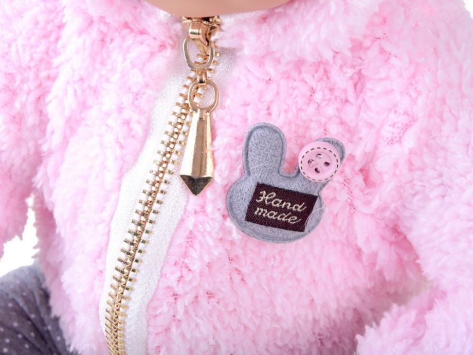 Lutka izgleda kao novorođenče. Ima trbuščić od mekanog materijala, a glava, ruke i noge izrađene su od tvrde gume. Kada je lutka postavljena, oči joj se zatvore. Kao prava beba, nema dlake na glavi, ali je od hladnoće štiti topla, na dodir ugodna ružičasta majica s kapuljačom. Cijeli outfit upotpunjuju elegantne sive tajice na točkice.