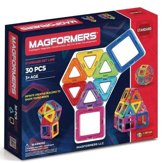 The basic Magformers set with triangles and squares. 30 pieces total: 12 triangles, 18 squares. Oppenheim Platinum Award Winner.Magnets embedded in the sides of triangles, squares and pentagons spin freely to automatically align properly and connect to each other upon contact. Magformers always connect regardless of their polarity.