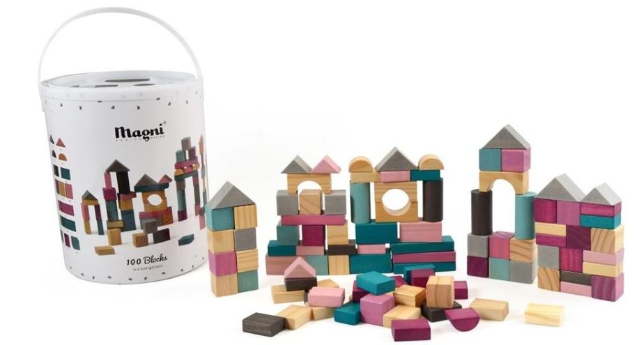Bucket with 100 wooden blocks. The bucket acts as a storage bucket and has a smart shape sorter function in the lid, which encourages play and strengthens knowledge of colors and shapes. Age 18m +