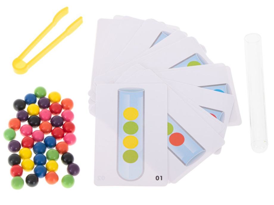 24 dvostrane kartice pružit će vam inspiraciju. Pokazuju uzorke koje treba posložiti u epruveti. Zadatak se može činiti jednostavan, ali će u početku sigurno biti izazovan!