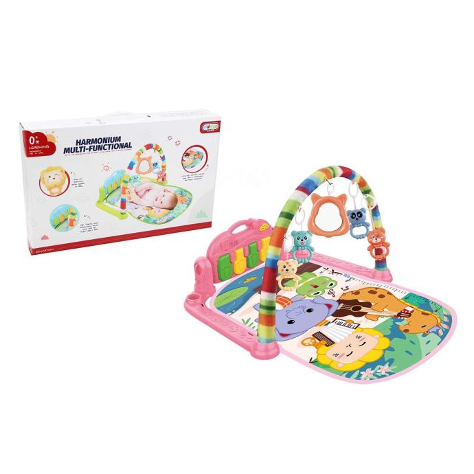 Mekana edukativna podloga s lukom i visećim igračkama potiče bebinu igru, pokrete i razvoj motoričkih sposobnosti. Uključuje svjetleću i zvučnu ploču s tipkama poput malog pianina koje sviraju različite melodije. Igračke se mogu skidati i koristiti zasebno. Pogodna je za bebe od rođenja, a izrađena je od sigurnih i mekanih materijala za udobnu i veselu igru.
