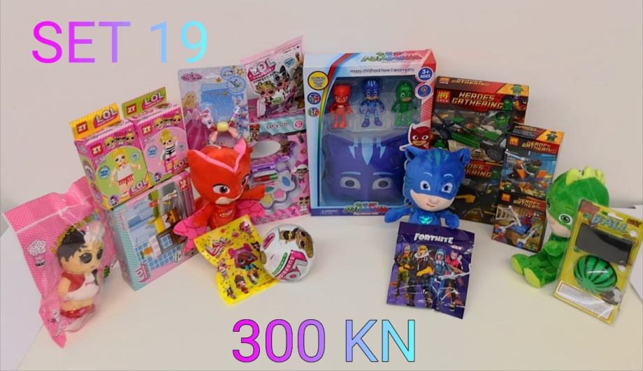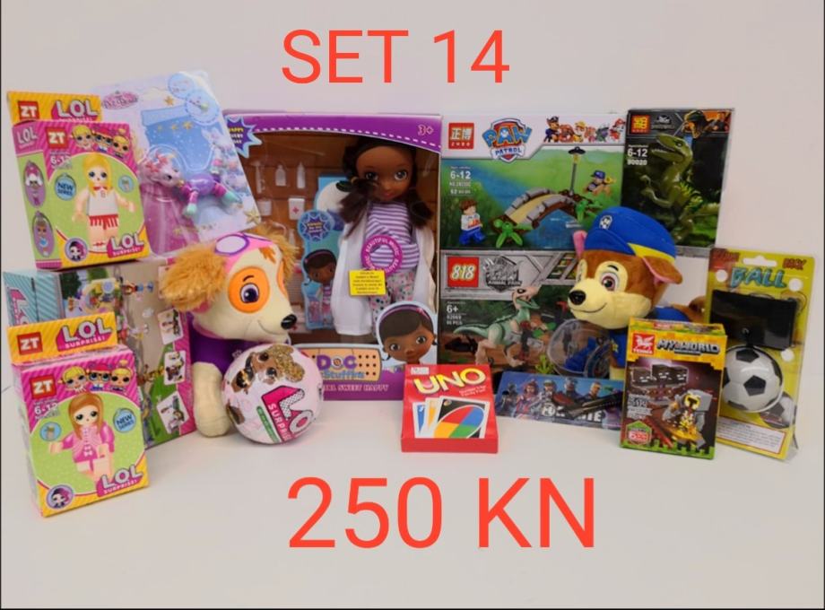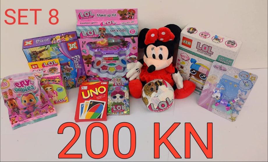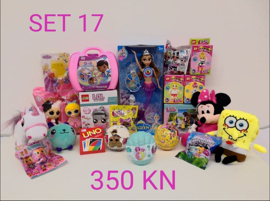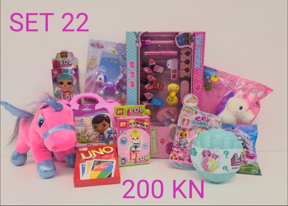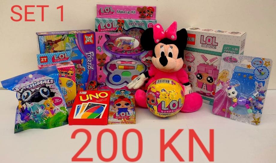 Zenski setovi:plisanac, sminka lol, lol lego veci, lol lego manji, lego frends, narukvoca za djecu zivotinje,lol suprise kugla, vrecice baby cry u jednom setu u drugom hacimals, lol karte, uno karte