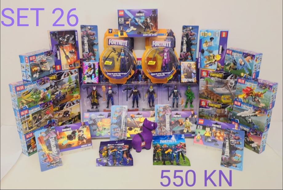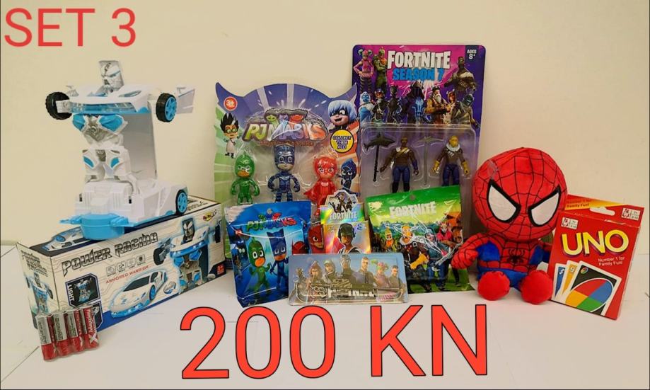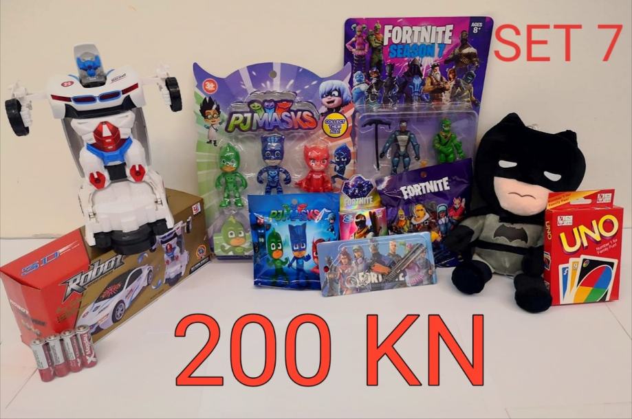 Muski setovi:plisanac, auto robot na baterije plus baterije, blister py mask, blister fortnite, vrecica fortnite i py mask, metalni privjesak fortnite, karte fortnite, karte uno