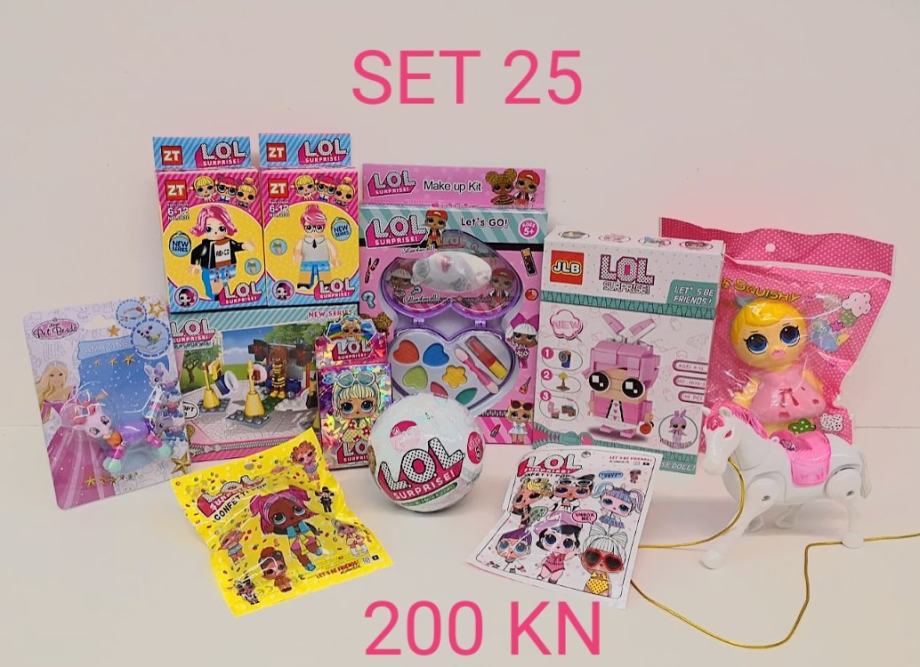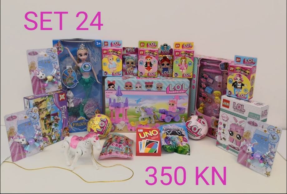 Zenski set veliki:velika lol kucica, velika lol sminka,pony na baterije, 2 lol suprise kugle, tri narukvice zivotinje, baby cry vrecica, hacižals vrecica, frozen lutka sirena, lol lego veci, 4 lol lega mala, lego frends, lol karte 2 pac, uno karte