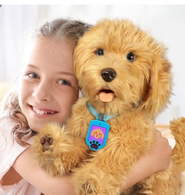 Moji is a lovable interactive Labradoodle with more than 150 interactions. Moji can do lots of tricks and responds by touch and commands.Moji has a smart collar that tells his thoughts and needs – and you can use the included Nurturing cards to check out what his care needs are. You can't help but just love Moji!37 cm high. 6years+Language: Danish and Swedish Features:•Obeys 10 voice commands•Smart collar•Multiple touch points•20 Nurturing cards for Moji's needs• Dozens of tricks•150+ reactions•40.5 cm from nose to tailDescription of features:Moji doing tricks! Tell what to do?Brush Moji's back, then his tail wagsPlay with the rope and he'll do drag playClap him and feed himMoji's collar shows how he feels: Happy, hungry w.mUse his smart collars to give Moji a bath or reward with a treatContains:Moji pet with smart collarFeeding bowlPlay rope,BrushCare cardsInstruction manual
