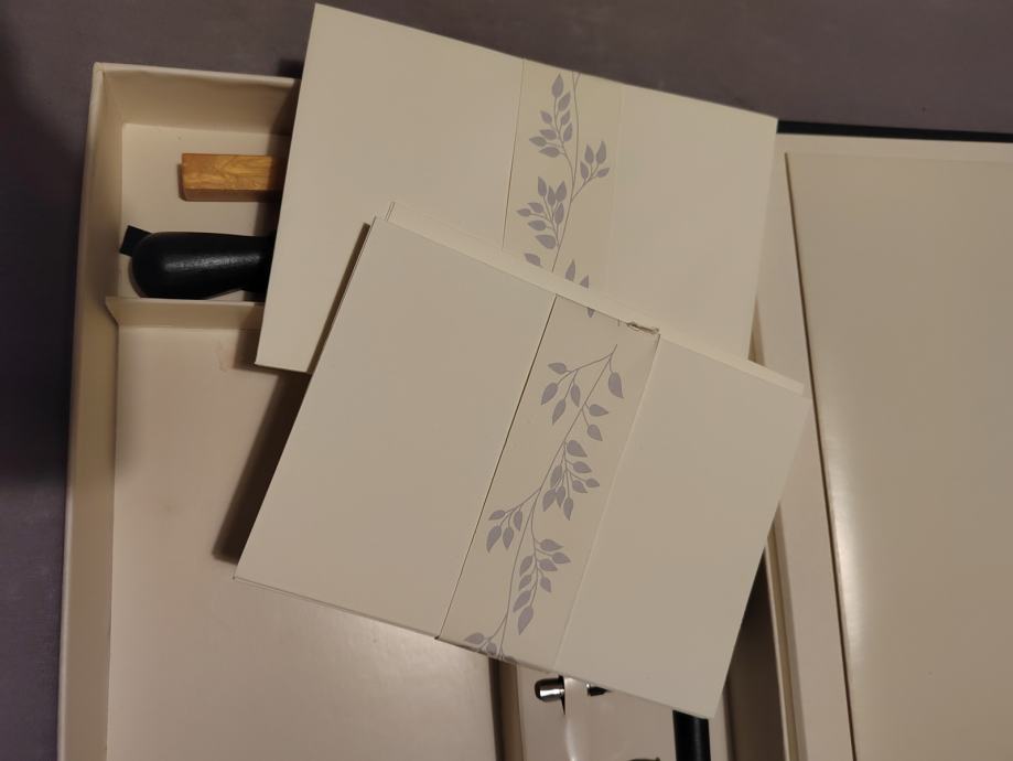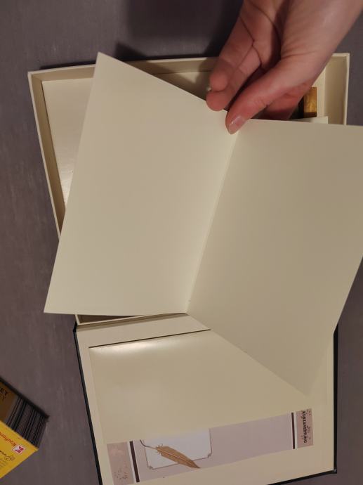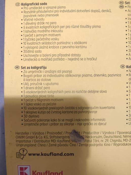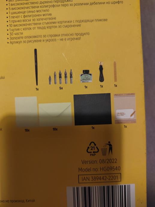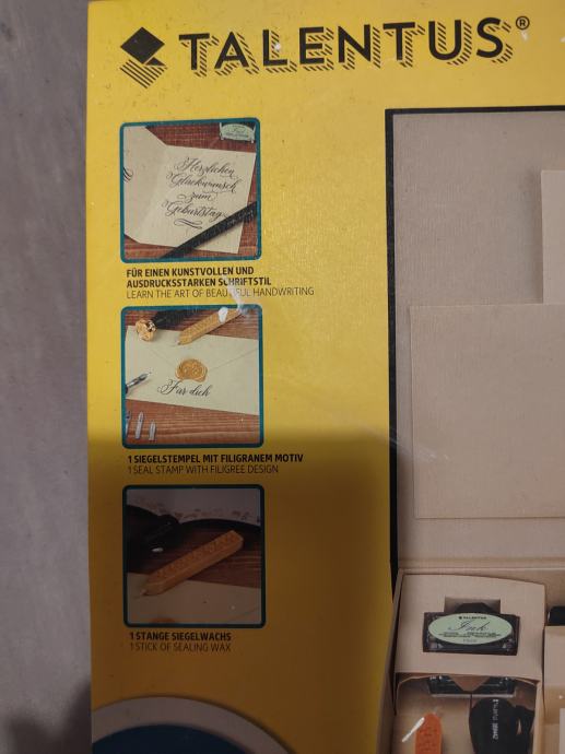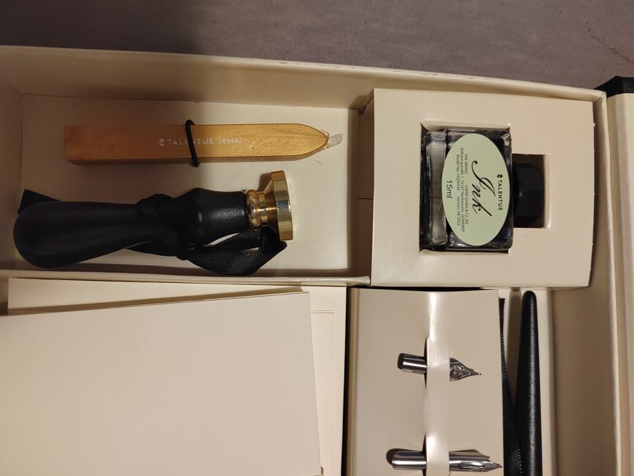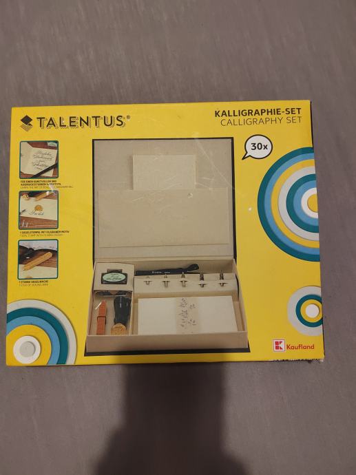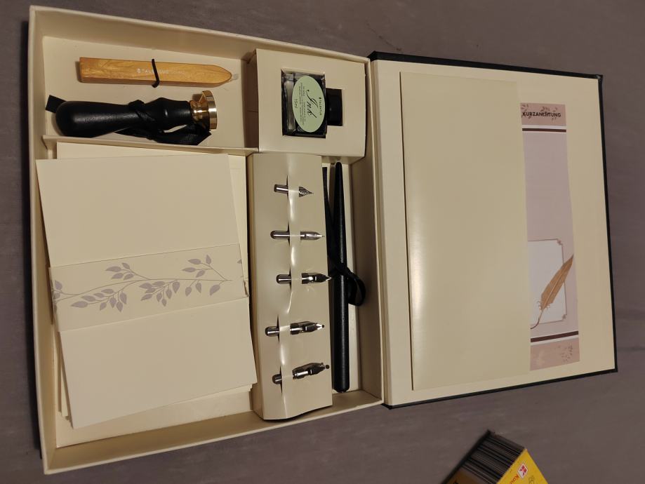 Nekorišteni set za kaliografiju. Dolazi sa uputama i svim djelovima. Sastoji se od pera sa raznim nastavcima, voska, pecata, tinte, omotnica i papira. Slanje tiskom ili paketomatom od pošte