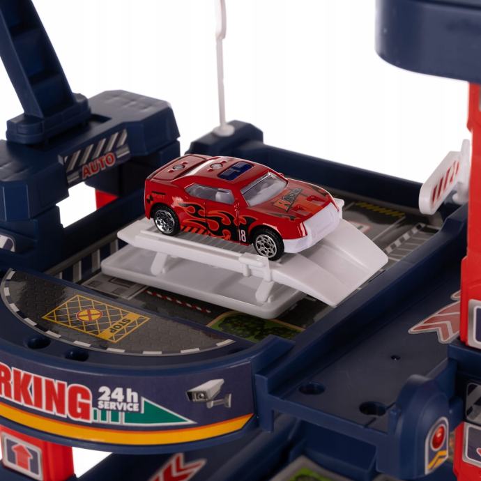 Komplet uključuje garažu za parkiranje s detaljnim dodacima kao što su rampe, tragovi i parking tragovi koji stvaraju pravo gradsko okruženje za parkiranje. Parkirna garaža kompatibilna je s mnogim vrstama igračaka sa standardnom veličinom. Dizalo se kreće gumbom na bateriju, omogućavajući djeci da lako podignu automobile na više katovo. Ova je garaža prikladna za djecu od 3 godine, jer podržava njihove motoričke sposobnosti i promiče igru uloga.