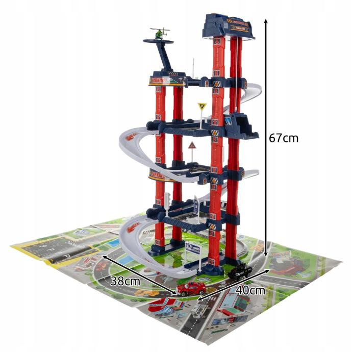 Dodaci koji peku vašu zabavu- komplet je kvalitetna ABS ploča s prikazom urbane infrastrukture za postavljanje garaže i postavljanje prometnih znakova. Ploča dodaje stvarnost i širi mogućnosti igranja, omogućujući vam da izgradite vlastite staze i scenarije. Komplet sadrži dva automobila - trkački automobil i borbeno vozilo - i helikopter izrađen od izdržljivih PS i ABS materijala. Skup prometnih znakova omogućuje vam stvaranje personalizirane i sigurne transportne infrastrukture. Svaka razina parkiranja može dodatno zalijepiti priložene naljepnice za podešavanje cestovnih znakova i oznaka, što znači da djeca mogu u potpunosti prilagoditi izgled garaže svojim potrebama i željama.