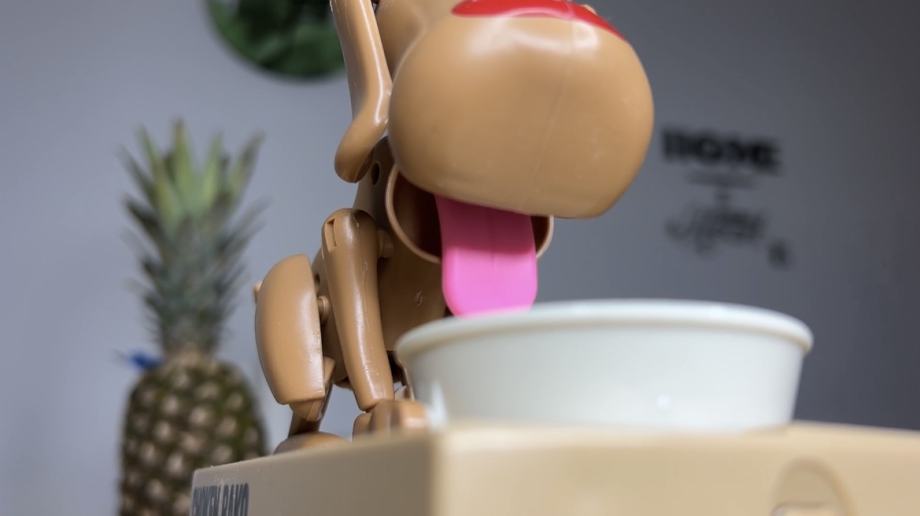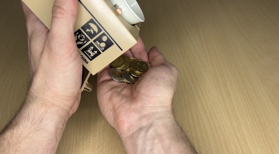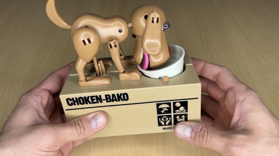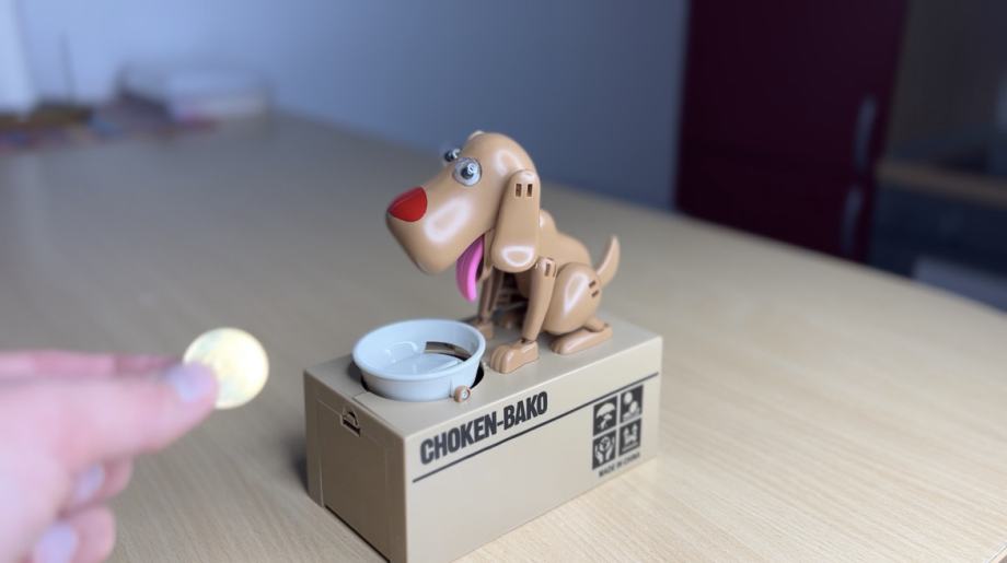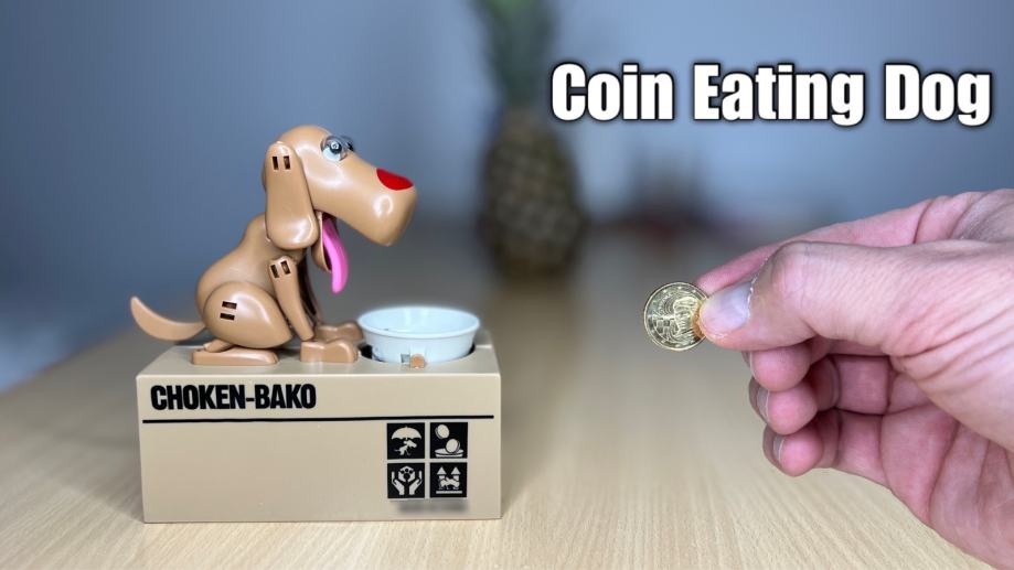 Stedna kasica psa koji jede kovanice, aktivira se kad mu se ubaci kovanica u posudu, te sprema kovanice u spremnik postolja.