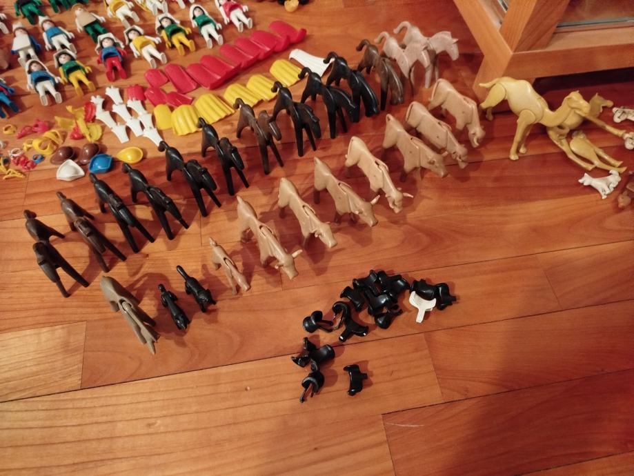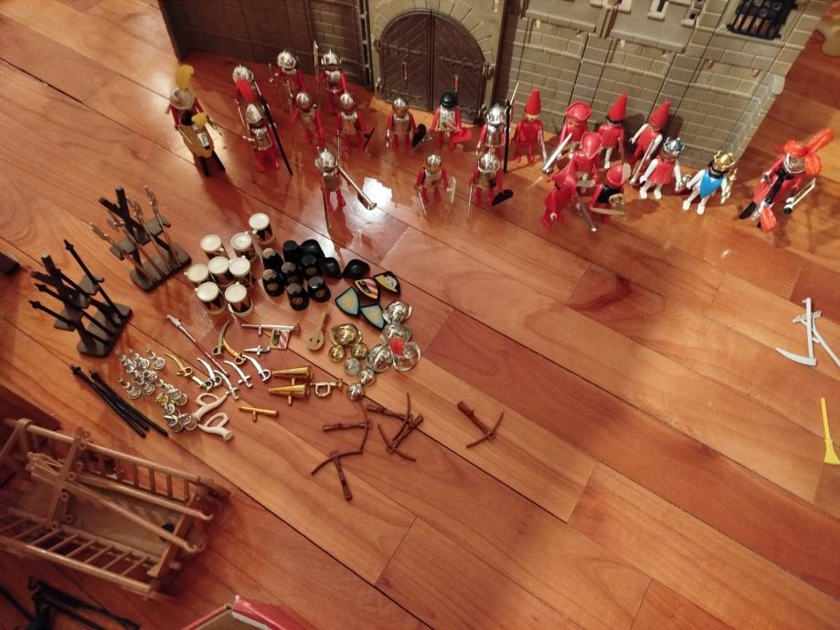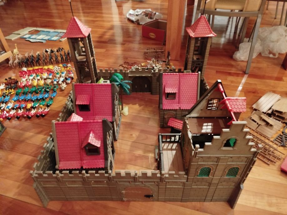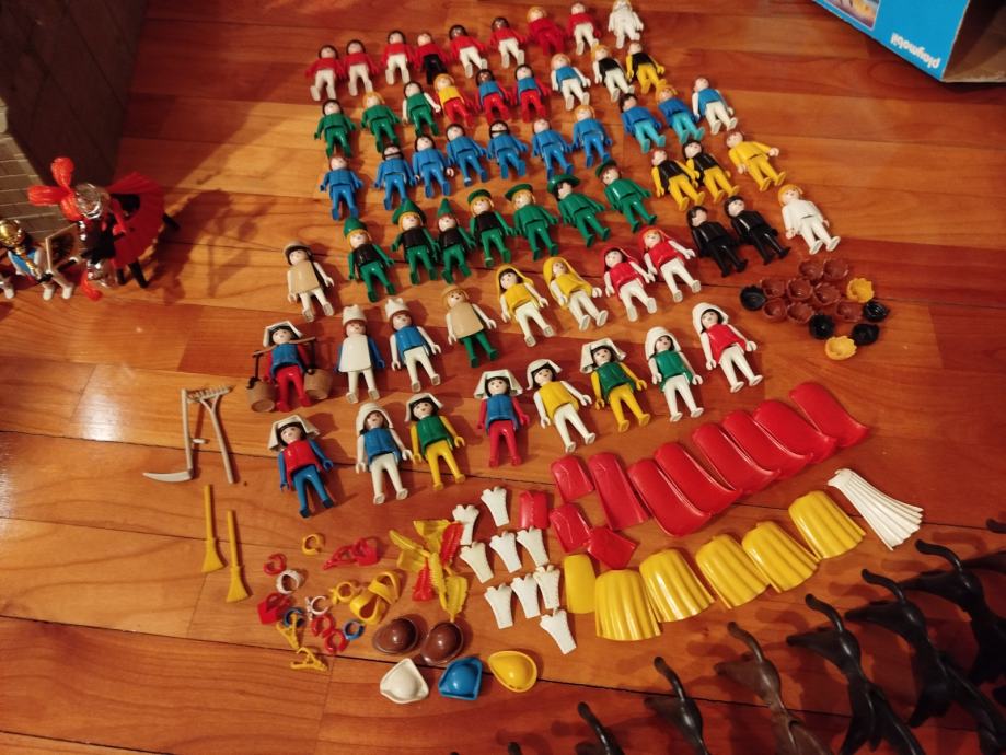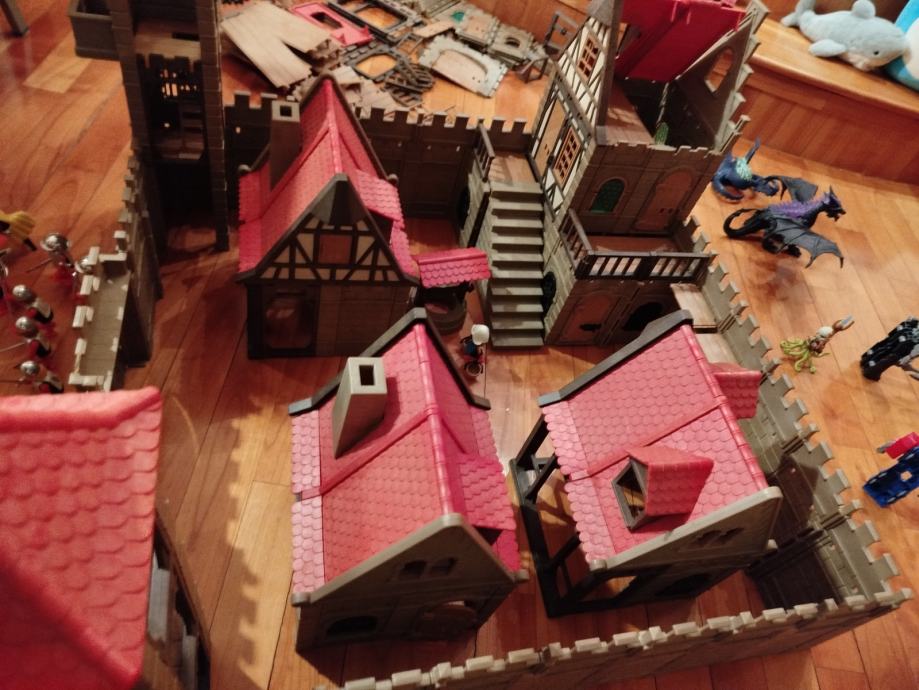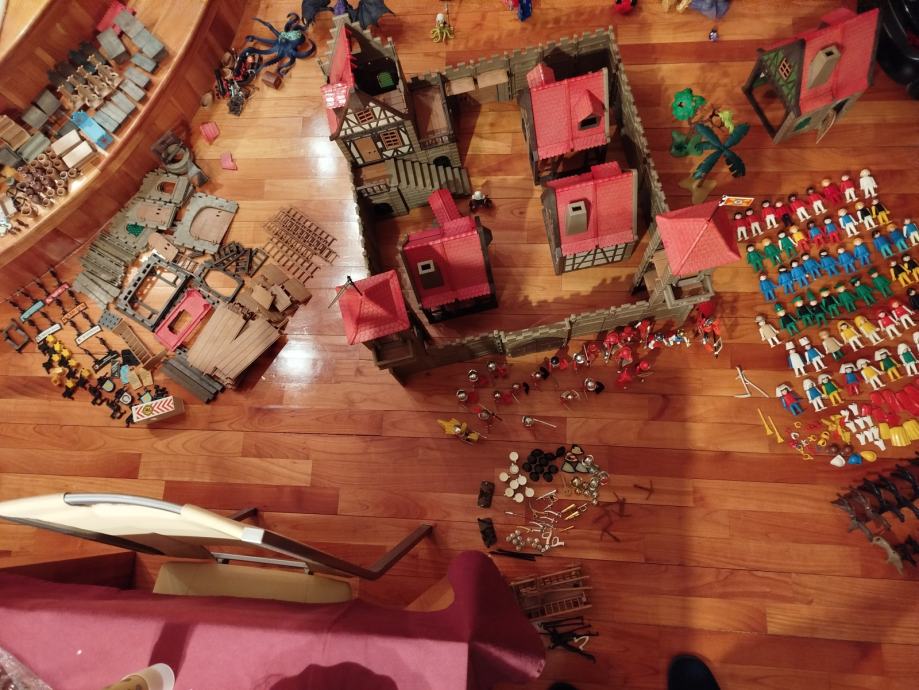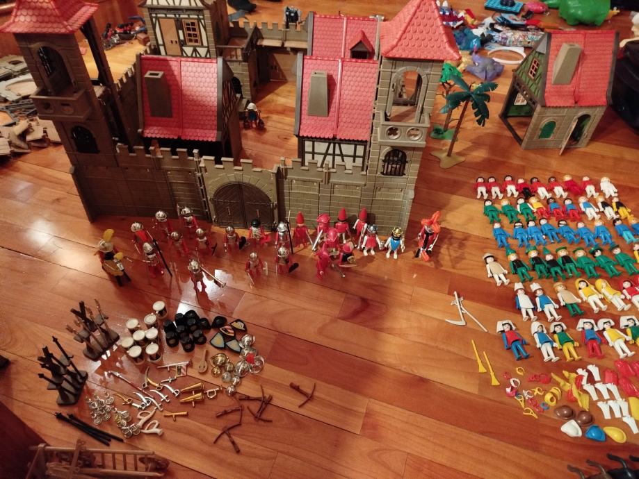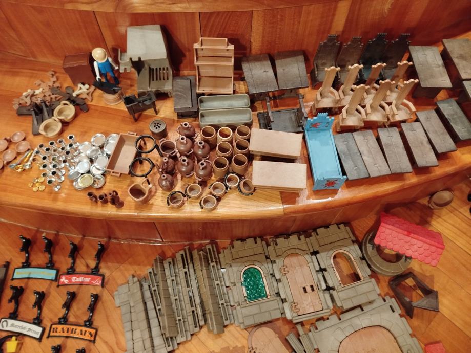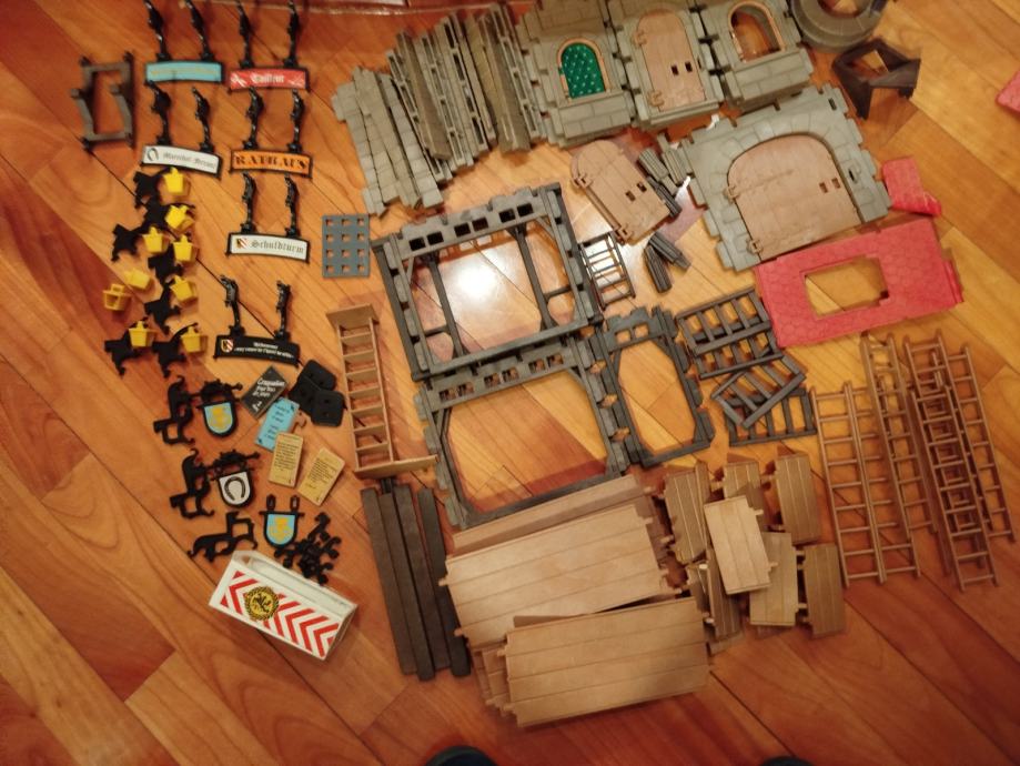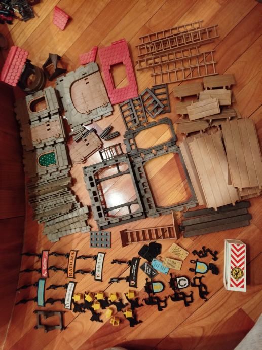 Veliki lot Playmobil dijelova dvorca iz 80ih, 4 kompletne srednjovjekovne kuće (kovačnica, pekarnica, krojačnica...), dijelova od 2 dvorca nekompletna, na slikama sastavljen dvorac iz glave radi prezentacije, 2 bunara, veliki lot figura, vitezova, oružja, životinja, namještaja, posuđa i ostalih sitnih dijelova.
