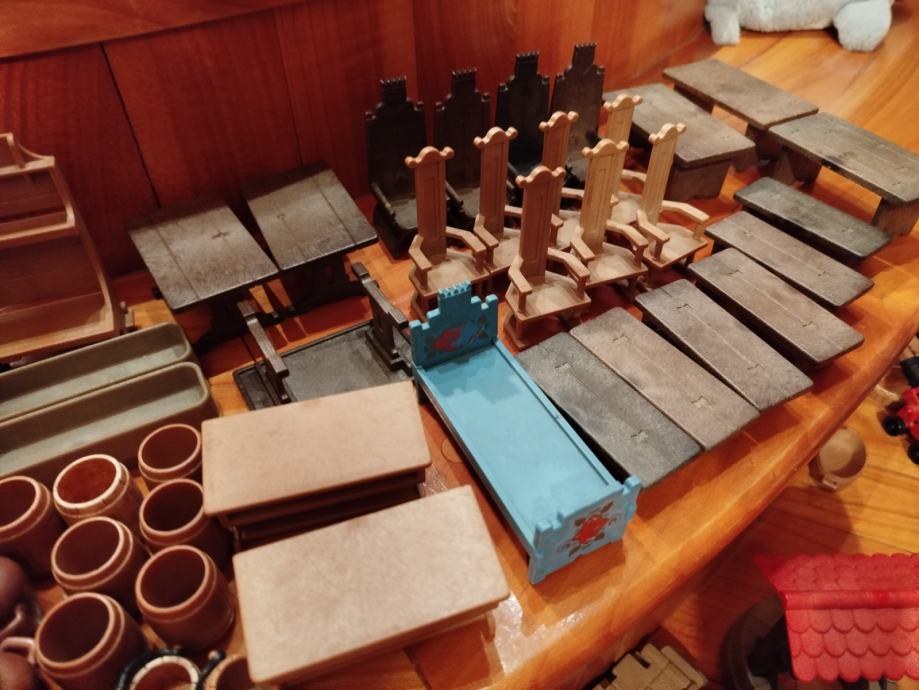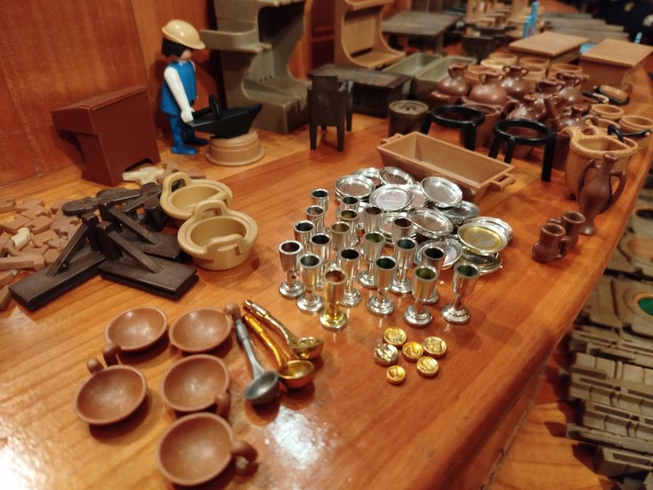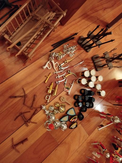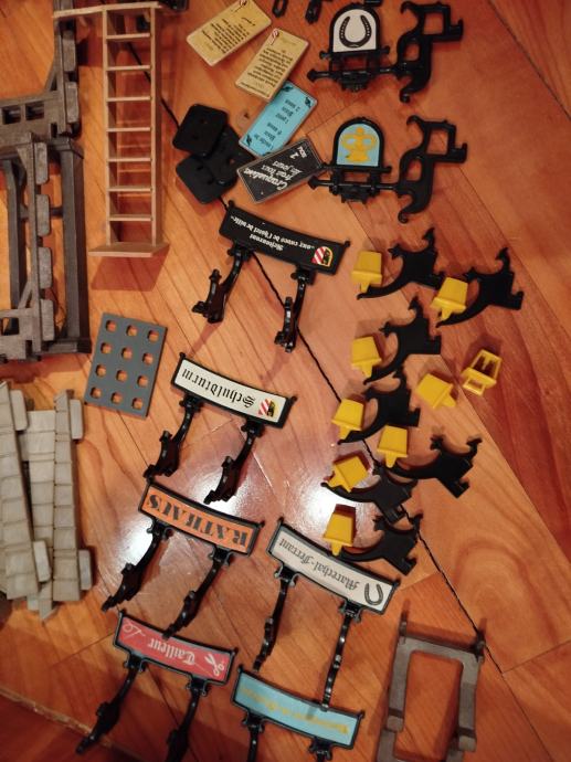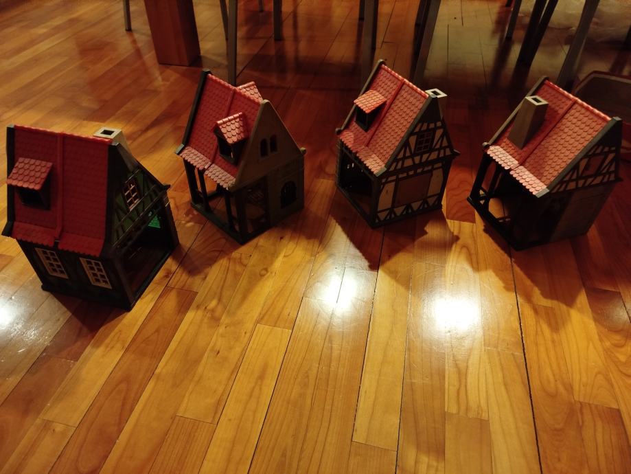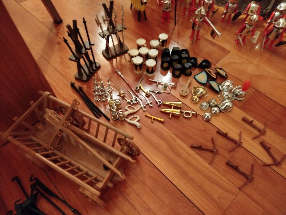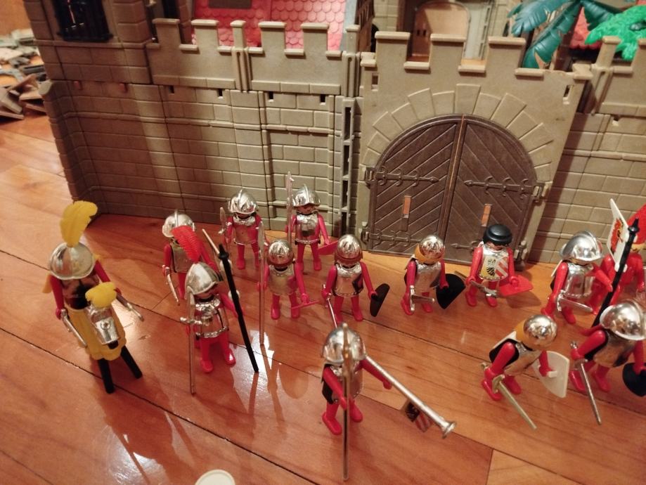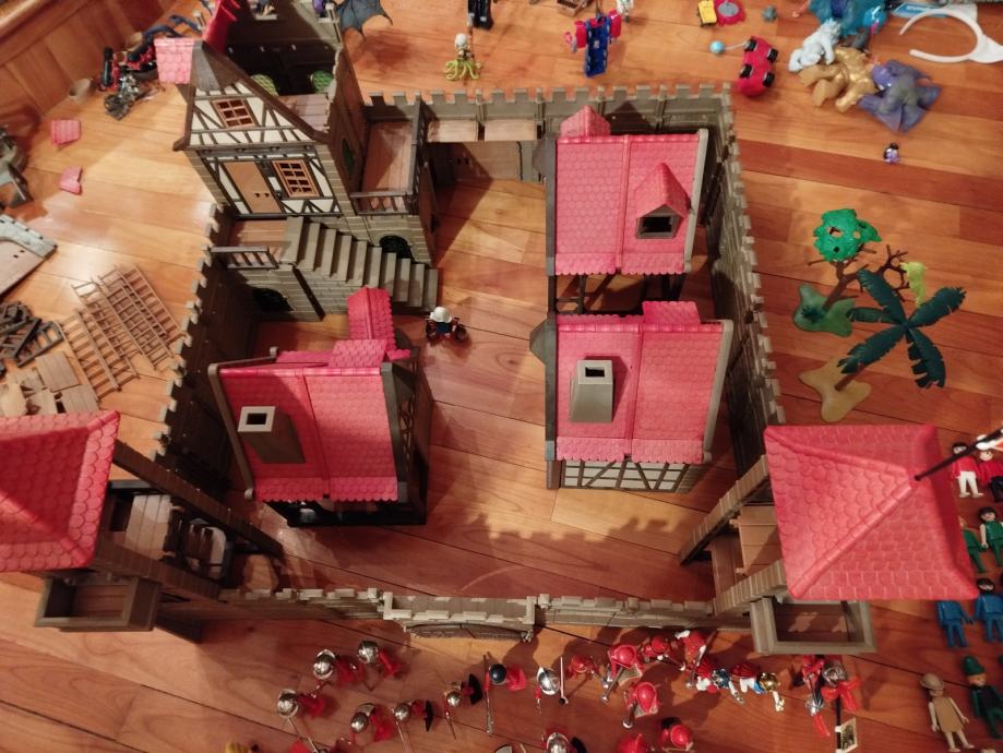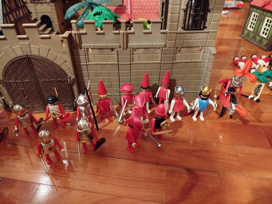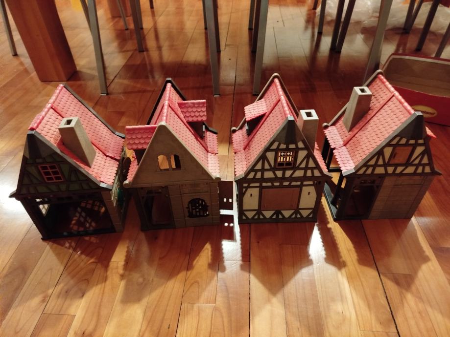 Veliki lot Playmobil dijelova dvorca iz 80ih, 4 kompletne srednjovjekovne kuće (kovačnica, pekarnica, krojačnica...), dijelova od 2 dvorca nekompletna, na slikama sastavljen dvorac iz glave radi prezentacije, 2 bunara, veliki lot figura, vitezova, oružja, životinja, namještaja, posuđa i ostalih sitnih dijelova.