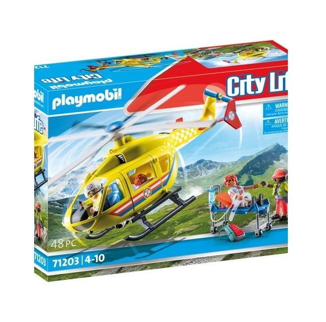 PLAYMOBIL Medical Helicopter with modern look! The injured hiker can be transported with the rescue stretcher. The rotor blades are movable. Dimensions: 36 x 13 x 16.5 cm (L x D x H)Take off on exciting search and rescue flights with the modern Medical Helicopter from PLAYMOBIL. The detailed helicopter has movable rotor blades as well as side doors, tailgate and cockpit window to open. There is room for two pilots in the cockpit. Injured patients can be pushed into the helicopter on the rescue stretcher and flown to hospital. A doctor's kit and first aid equipment are on board for first aid at the accident site. A detailed toy set for inquisitive children who would like to immerse themselves in the everyday life of rescue workers.The PLAYMOBIL toy for children aged 4 and up includes three PLAYMOBIL figures, a rescue helicopter, an ambulance stretcher, first aid kit and many other extras for thrilling play action in the children's room. With the included bandage labels, the injured can be treated individually. The rolling legs of the stretcher can be folded in and the stretcher can be carried by two people on handles.The PLAYMOBIL City Life series includes modern vehicles and realistic models with which children can develop important skills and self-confidence.