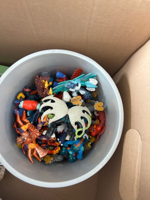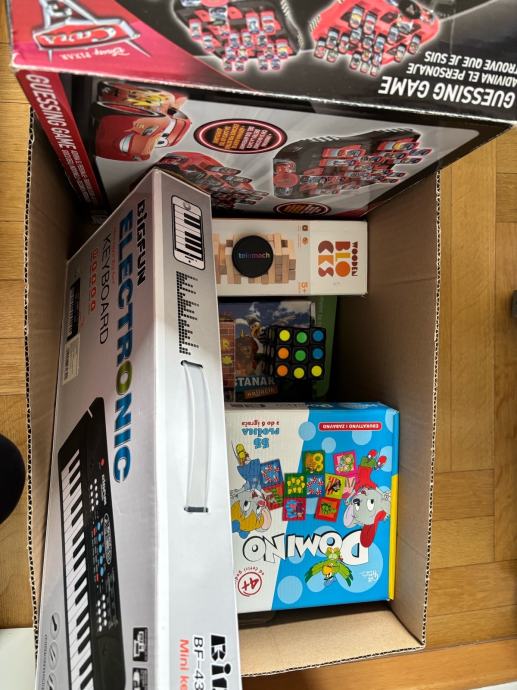 Poklanjam razne igračke. Nalazi se nekoliko različitih stvari: plišane igračke, veća kutija s društvenim igrama poput domina, guessing igre s Cars motivima, elektronički klavir te kutija puna Gormita.