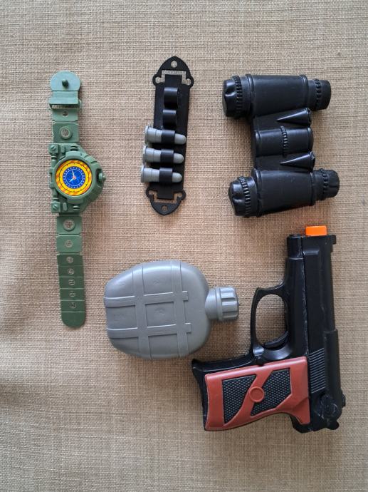 Prodajem igračku pištolj sa dodatnim kompletom koji čine sat, vojna čuturica, pricuvni meci i dalekozor, u dobrom stanju, sve za što 5 eura. Moguće preuzimanje u centru grada radnim danom i vikendom u Novom Zagrebu. Slanje Tiskom ili poštom na račun kupca.