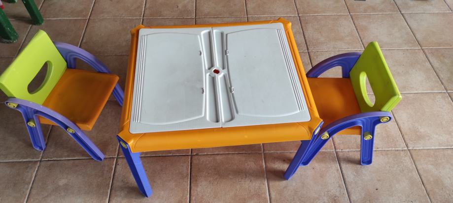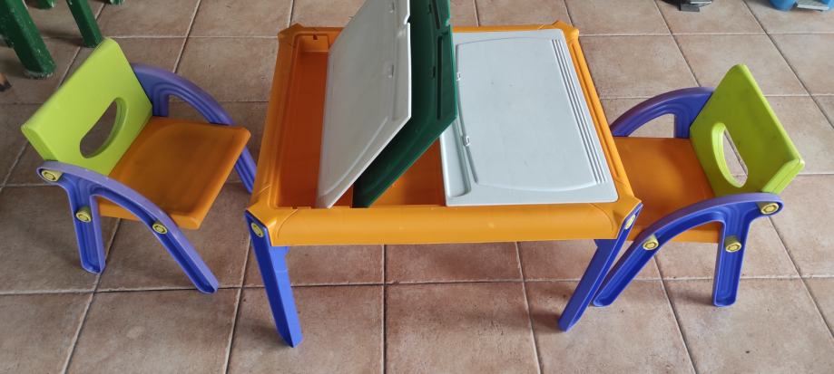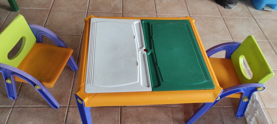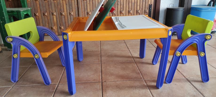 moguća kombinacija ploha kao što se vidi na slikama. ispod ploha ima udubljenje gdje se spremaju bojice itd. uz stol dolaze 2 pripadajuče stolice. u vrlo dobrom stanju