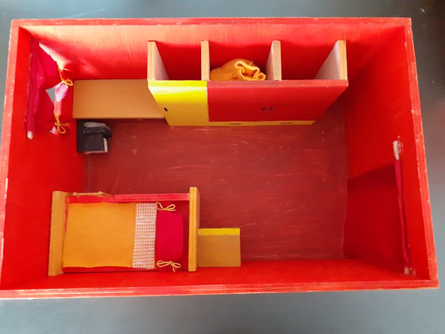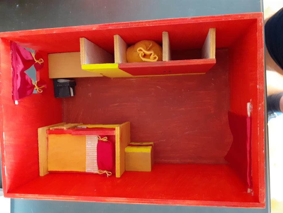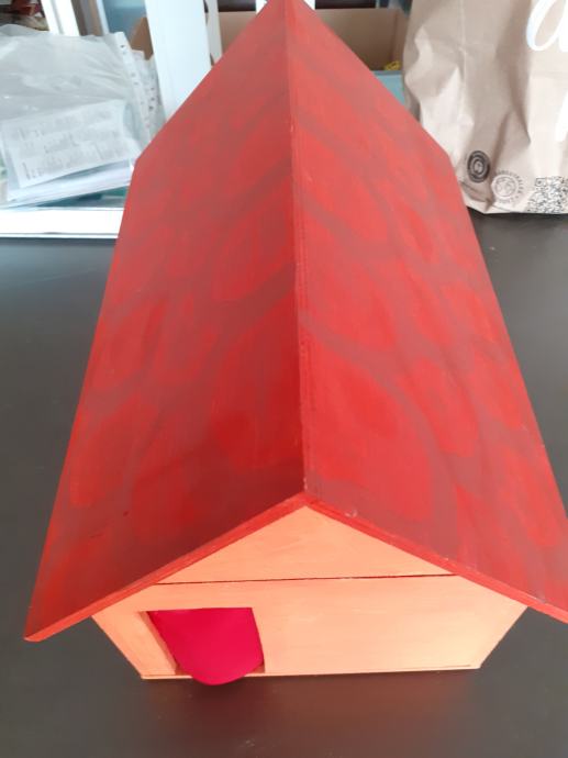 Ručno rađena kuća za lutke s namještajem i krovom koji se može skinuti; dimenzije: visina 26 cm, širina 23 cm, duljina 34 cm