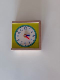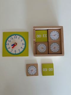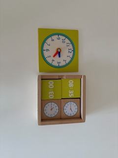 Drvena edukativna igračka Playtive JUNIOR za učenje čitanja vremena pomoću kazaljki na satu. Sastoji se od više djelova kao na slikama. Na većoj drvenoj ploči kazaljke se mogu pomicati kako bi se prikazalo željeno vrijeme. Na manjim drvenim pločicama jedna strana prikazuje vrijeme kao na digitalnom satu, a druga isto vrijeme na satu s kazaljkama.