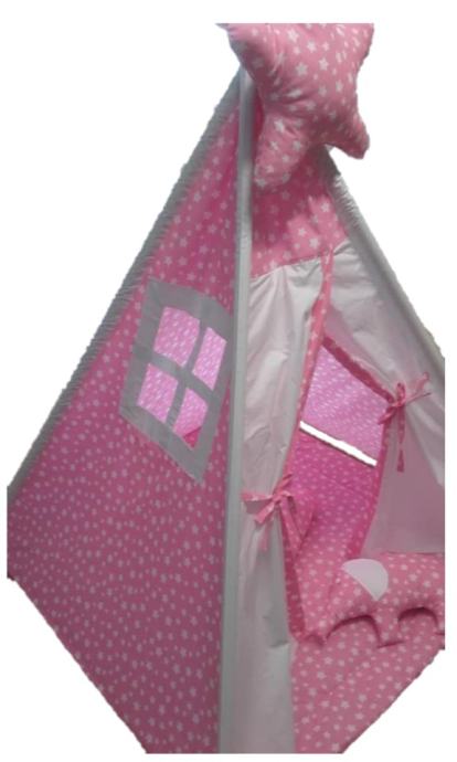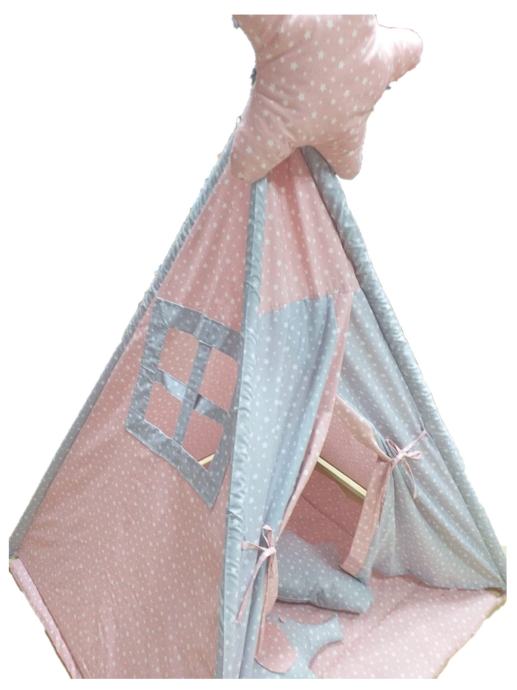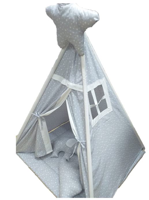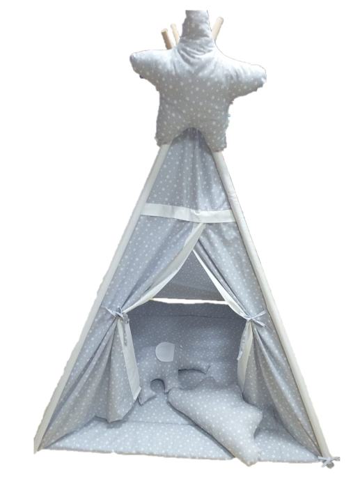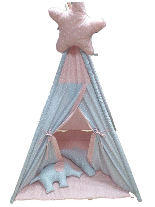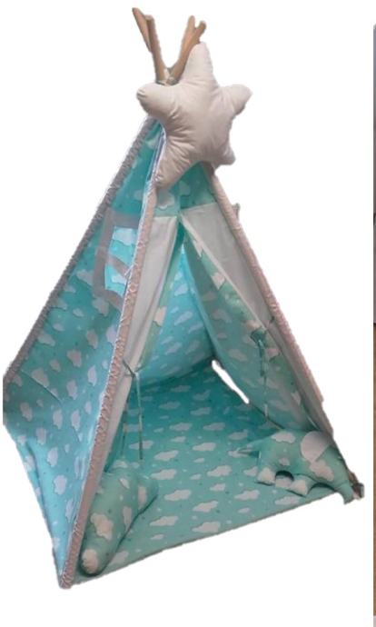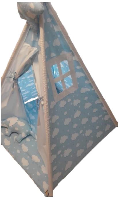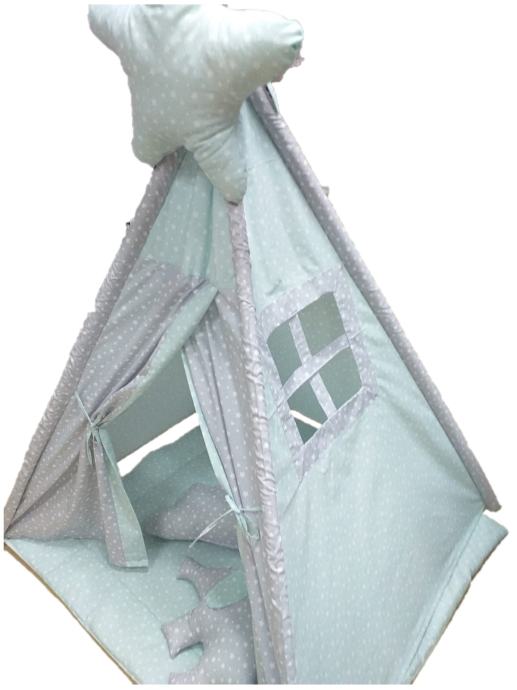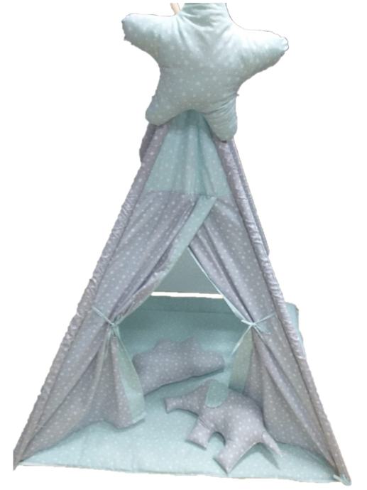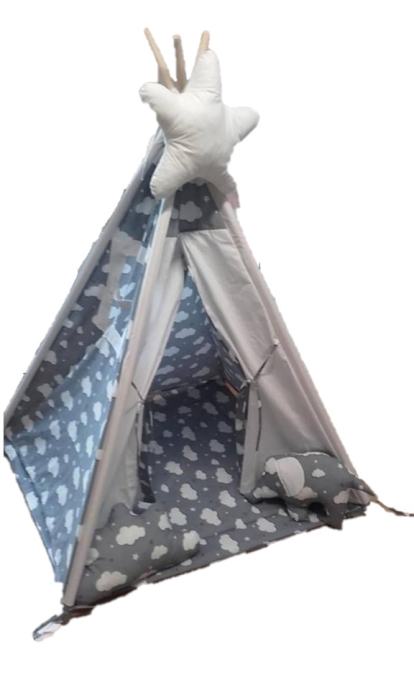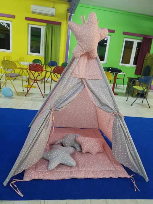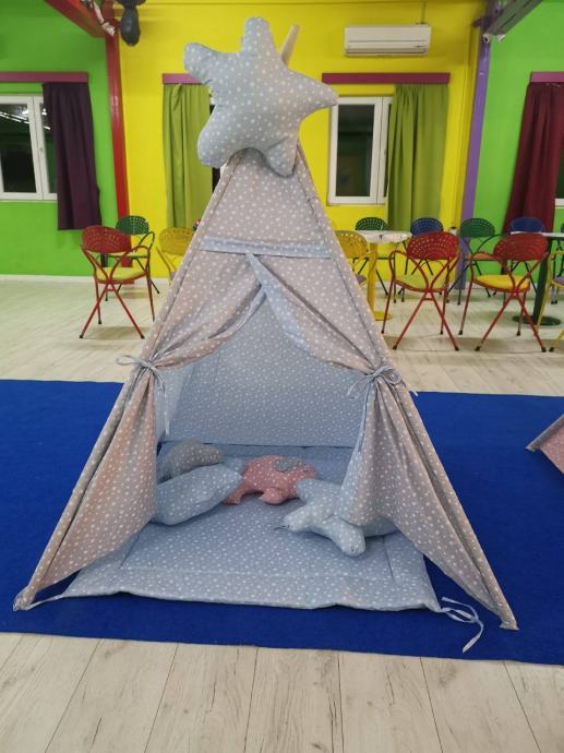 Svi mi koji imamo djecu svjedoci smo da naši mališani vole slagati neki svoj "odvojeni" prostor pa tako nebrojeno puta iskoriste sve što im se nađe pod rukom kako bi slagali svoj šator u kući ili stanu te koriste stolice, vješalice, deke, poplune, stolnjake...Tako smo i mi došli na ideju napraviti čvrst, kvalitetan i siguran šator po pristupačnoj cijeni koji se sa lakoćom postavlja (rastvori i učvrsti podloga ušivenim vezicama), isti tako se u trenu sklopi i može se odložiti u ćošak, ispod kreveta jer sklopljen zauzima jako malo prostora. Šator za igru rastvoren je visine 150 cm, a sklopljen cca175 cm. Sašiven od kvalitetnog 100% pamučnog platna i čvrste drvene konstrukcije. U kompletu sa šatorom dolazi mekana i topla podloga za igru, zvijezdica koja se može pričvrstiti na vrh šatora, te još dvije mekane igračke- oblačić i slonić.