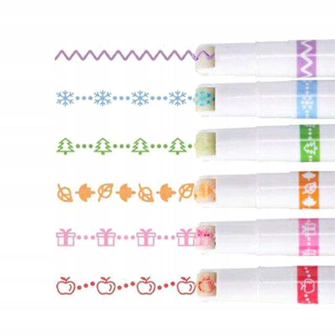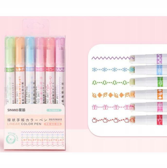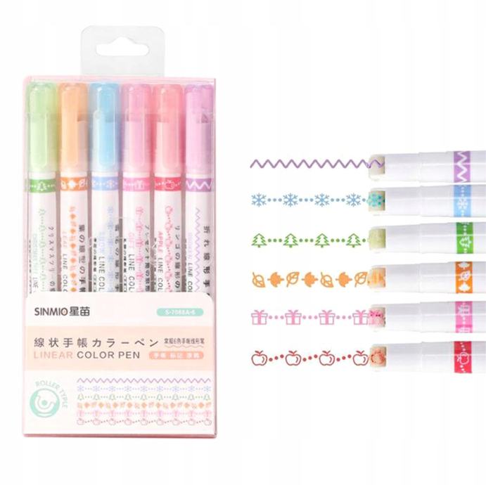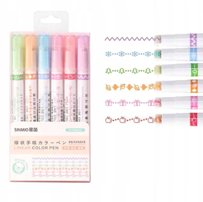 Postavite 6 markera različitih boja. Svaki marker crta drugačiji uzorak. Atraktivan izgled uzoraka potaknut će djecu da nauče pisanje. Savršeni su za naglašavanje nota ili stvaranje ukrasa. Zbog ergonomskog oblika, olovka je ugodna za upotrebu. Tinta se brzo suši, tako da note ne razmazuju.