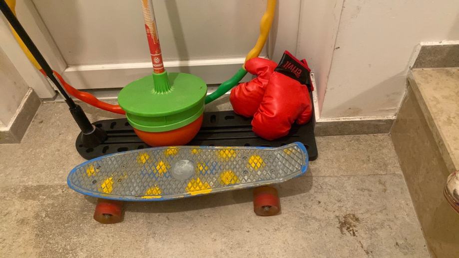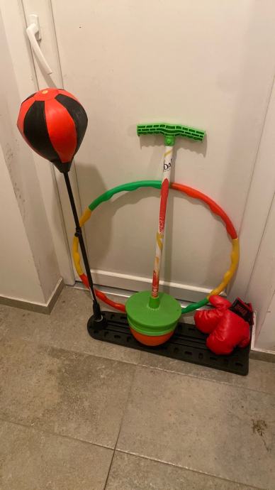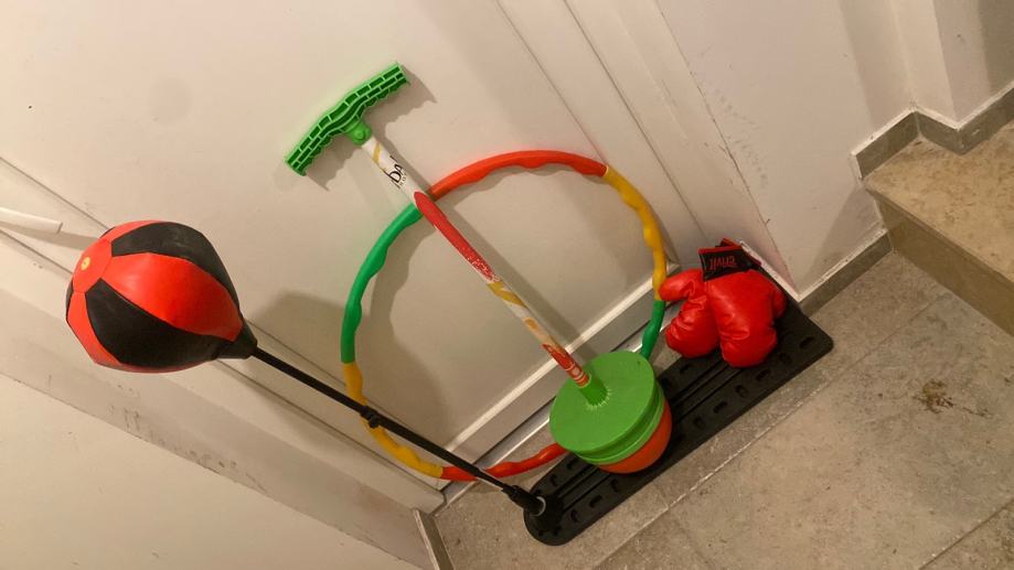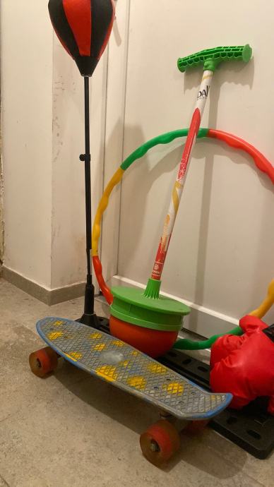 Skateboard, vreca za boks sa stalkom i rukavice, hula hop i skakalica