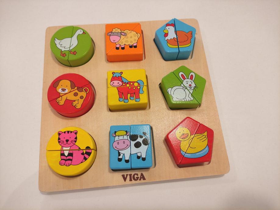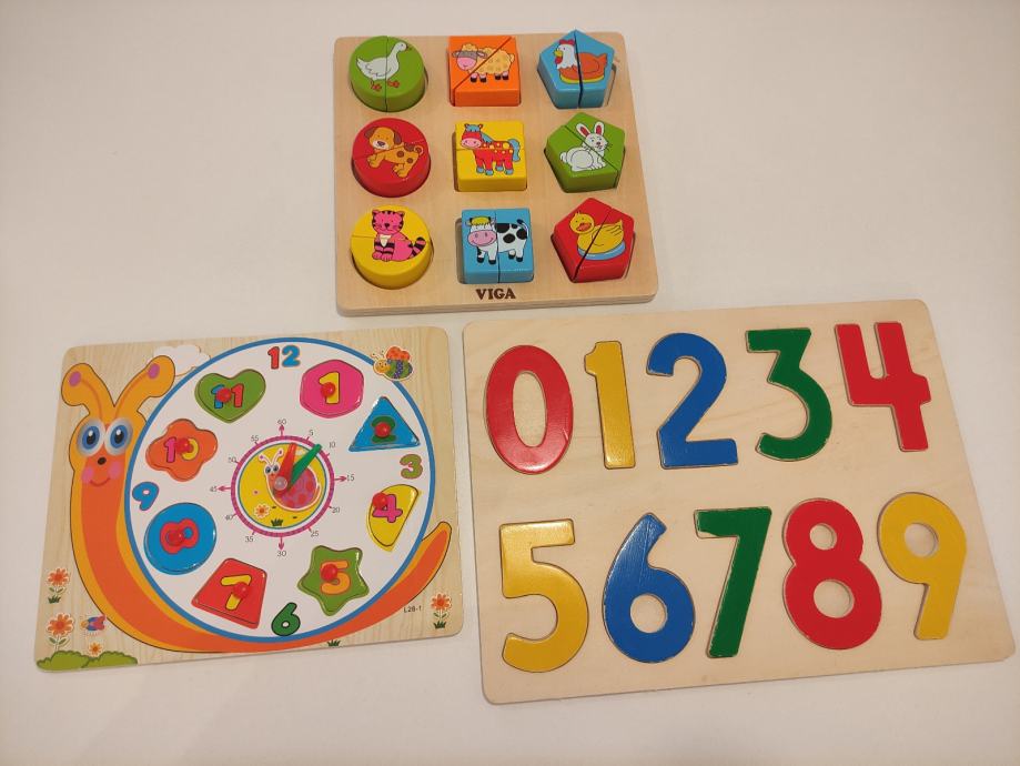 Korištene, očuvane tri drvene umetaljke: VIGA umetaljka životinje, umetaljka puž/sat i umetaljka brojevi