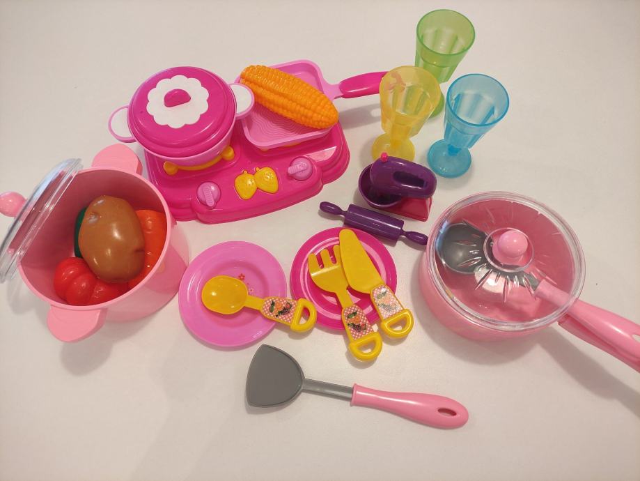 Set za igru kuhanja: lonci, tava, tanjurići, čaše, pribor, povrće, mikser, valjak