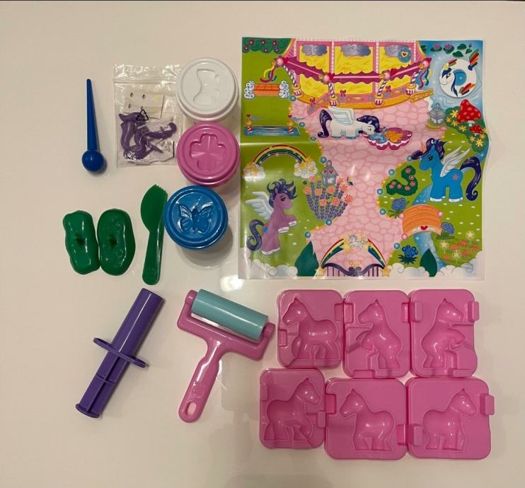 Predivan playtive set za modeliranje ponija 3+ s oko 30-ak dijelova i podlogom za modeliranje.