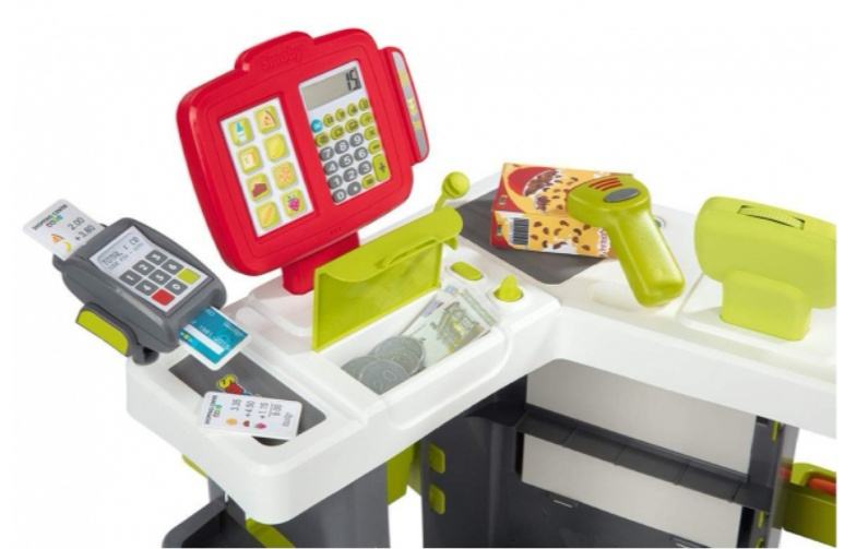 Set sadrži: elektroničku blgajnu, pravi kalkulator s integriranim LCD zaslonom, elektronsko skeniranje sa zvukom i svjetlom te brojne druge dodatke.