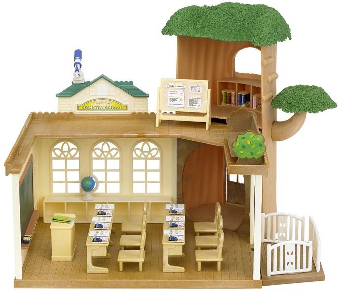 The Country Tree School is such a fun school! Whilst there is a classroom which comes furnished for lessons for up to 6 Sylvanian children, complete with 6 seats and desks, the teacher's desk and whiteboard, there is also a tree to climb in breaktime! A balcony overlooking the beautiful Sylvanian scenery provides the perfect platform for pupils to get inspired for their art lessons or spot some wildlife. For any little star-gazers, there is a telescope fitted to the roof which can also be connected to the tree for a better view. Finally, there is also a bench for your little Sylvanians to relax after many hours practising their sums and ABCs.Includes:1 school, 1 tree, 2 desks, 6 chairs, 1 teacher's desk, 1 whiteboard, 1 bench, assorted accessories.Sylvanian Families evergreen toy appeals to young children just making their first friends and older children about to start secondary school. Grow your Sylvanian Village and create your own unique Sylvanian World as your collection expands.Sylvanian Families let children craft their own stories, and helps them develop social skills and emotional intelligence through imaginative play. Sylvania is a sanctuary where everyone can be part of the family, letting children learn about relationships, including being kind to each other.