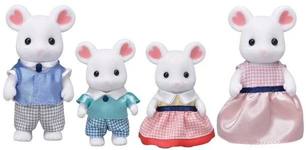 Mother Bianca Marshmallow is an incredibly well organised mouse, and runs the Grocery Market in the village. Her store stocks a great variety of every day necessities, so the Sylvanians are always visiting to pick up essentials they may have run out of. Bianca is also very good at chess, which is one of her favourite hobbies.Father Bernard Marshmallow isn't very good with details, so isn't as organised as his lovely wife. However when it comes to his homemade cheese collection he knows the recipe for every single variety and loves to make delicious cheese dishes for his whole family. Bernard dreams of opening his very own Pizzeria one day, with a four-cheese pizza as the chef's special! Sister Katherine Marshmallow is a very clever young mouse, and is excellent at maths and science. However she can be quite forgetful. Katherine sometimes helps out at her mother's shop on Saturdays, and while she can add up the grocery prices very easily, she can often forget how much things cost!Brother Christopher Marshmallow is the complete opposite of his sister. He has an excellent memory, and can remember every ingredient of his father's prized cheese recipes. But ask him to work out the recipe quantities, or to convert the oven temperature, he can sometimes get stuck, maths is not Christopher's strong point!Sylvanian Families evergreen toy appeals to young children just making their first friends and older children about to start secondary school. Grow your Sylvanian Village and create your own unique Sylvanian World as your collection expands.Sylvanian Families let children craft their own stories, and helps them develop social skills and emotional intelligence through imaginative play. Sylvania is a sanctuary where everyone can be part of the family, letting children learn about relationships, including being kind to each other.