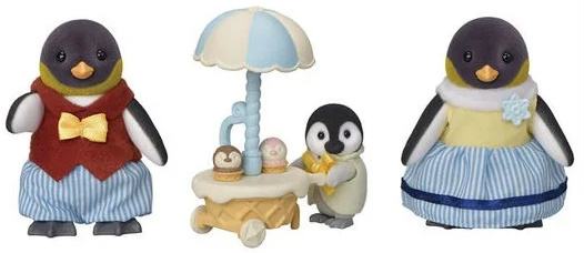 Set featuring the Penguin family, whose round shape and cute markings have made them popular with the other Families. Includes Penguin father, mother, baby and an ice cream wagon.The figures' arms, legs and heads can be moved to put them in different poses.The ice cream can be held by the baby figure, and the wagon's parasol by the adults.Introducing Penguin father Ozzie, mother Sapphire, and their baby son, Kippie.