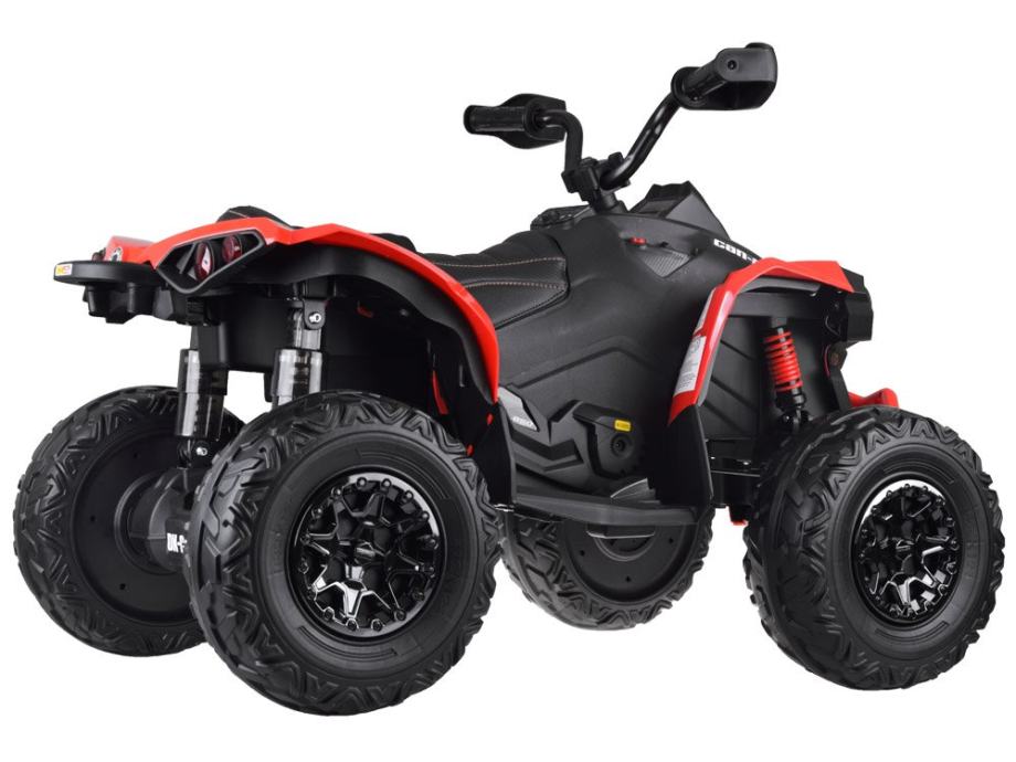 Terenski Quad CAN-AM s EVA kotačima i stražnjim amortizerima pružit će svakom malom vozaču puno zabave u vožnji. Vozilo je bilo bogato opremljeno. Ima min. glazbena ploča, prednje/stražnje osvjetljenje, mekano sjedalo presvučeno eko kožom sa sigurnosnim pojasevima i udoban upravljač s presvlakama. Udoban quad zadovoljit će zahtjeve svakog vozača. Quad ima: 2 snažna motora od 24V 200W + 1 x 24V 5Ah gel bateriju.
