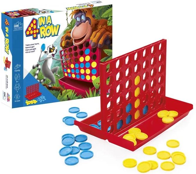 Object of game: To be the Frst player to get 4 in a Row horizontally, vertically or diagonallyContents:Game grid unit42 counters: 21 yellow, 21 blueInstruction sheetSet up: Place the game grid on flat surface between you and your opponent. Ensure that the grid is clicked in position by sliding the top of the grid sideways; it should drop into the upright position. Decide which colour you will be and take all the counters of that colour. Place all your counters into the tray at the bottom of the grid on your side, ready to play.How to play:Youngest player should go first and drop one of their counters into any of the slots atthe top of the game grid.Take turns in doing this; you should be trying to get 4 of your coloured counters in arow, at the same time as blocking your opponent from doing the same - be tactical!When one player gets 4 in a Row of their coloured counters, they are the winner.Lift the grid unit up to release all the counters for a new game.