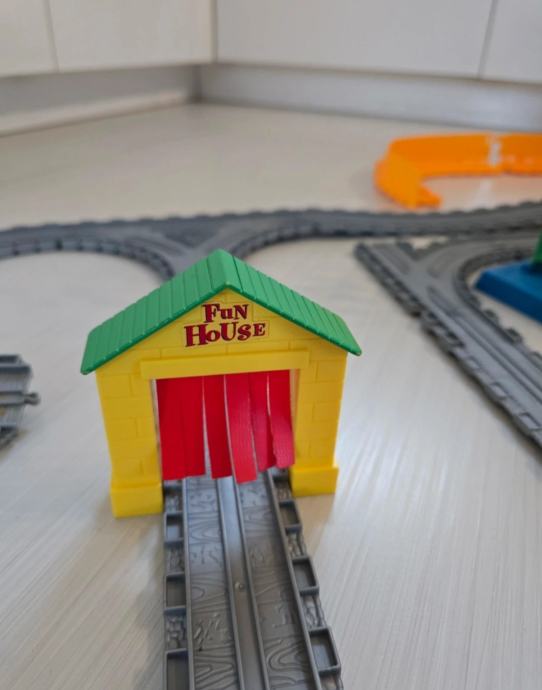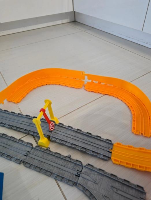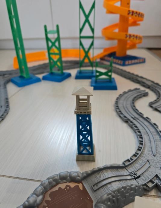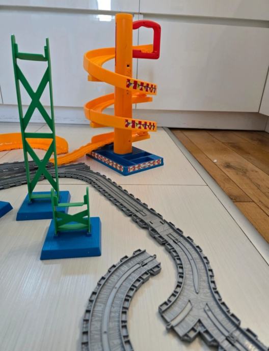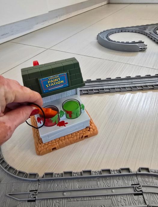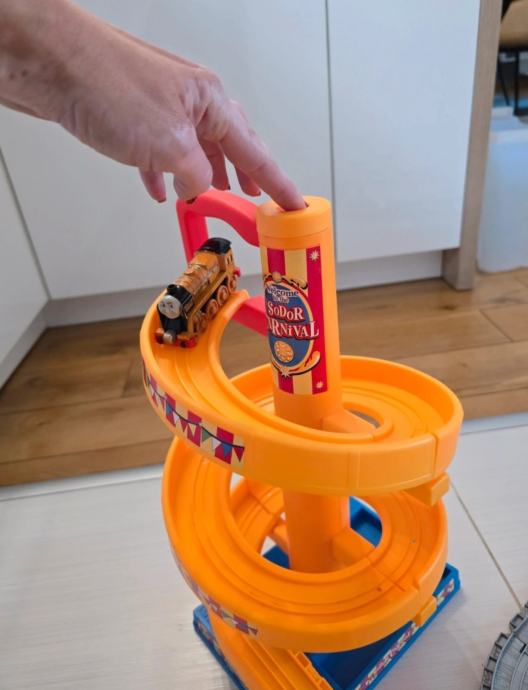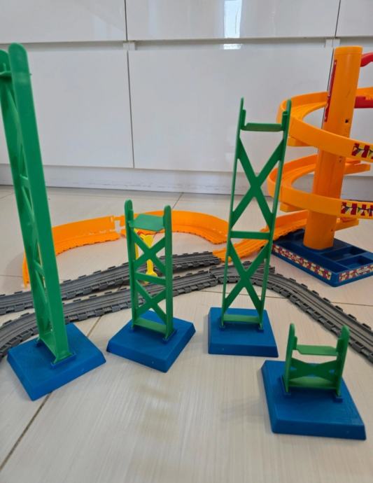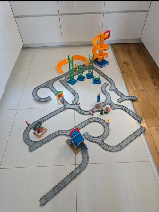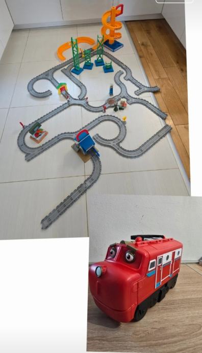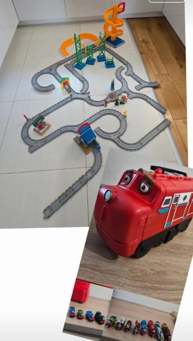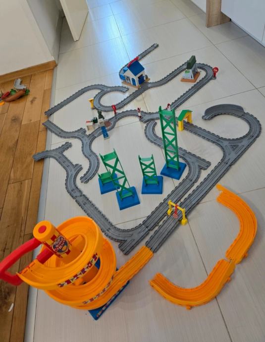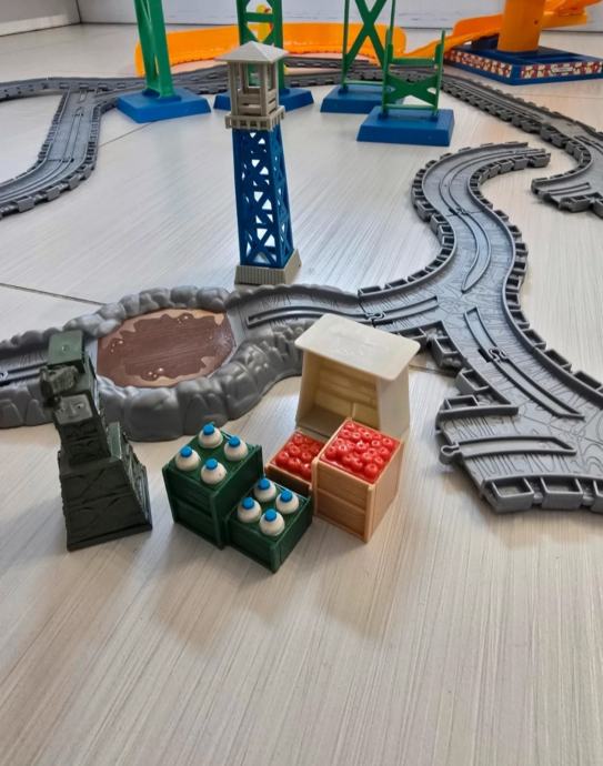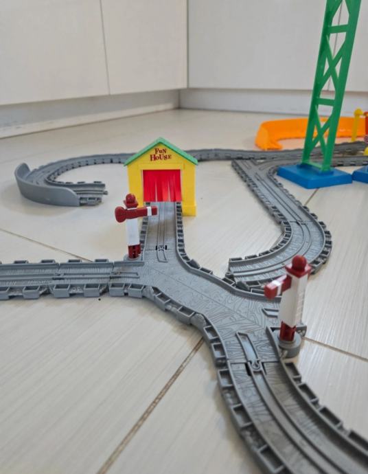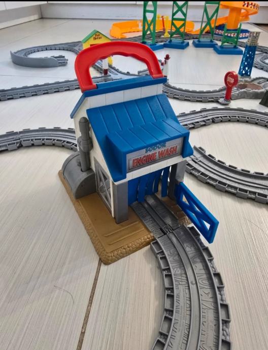 Pista ima mnogo dijelova,tračnice, praonicu, postaju za bojanje,mjerenje visine,pistu za spuštanje vlakova koja se pokrece stiskom i istovremeno svira 3 glazbe/zvuka.