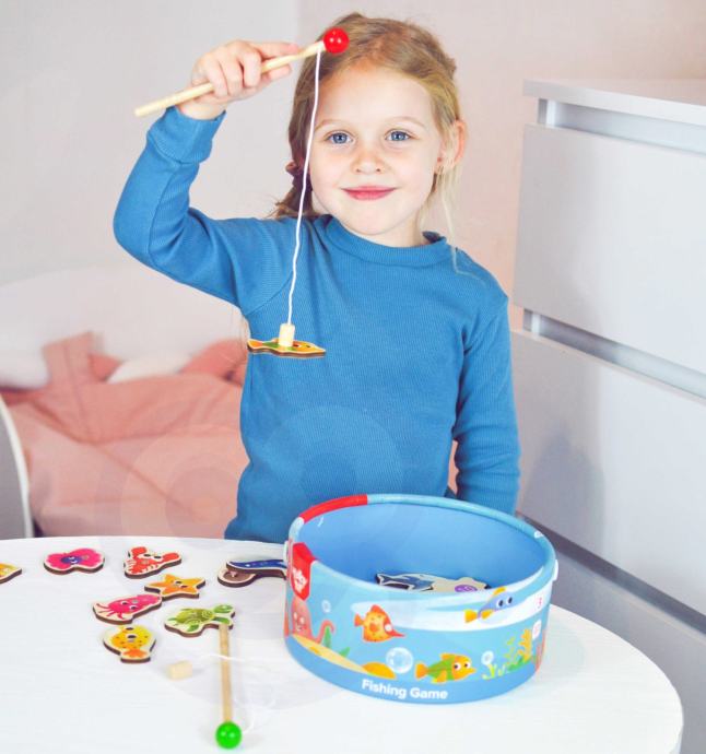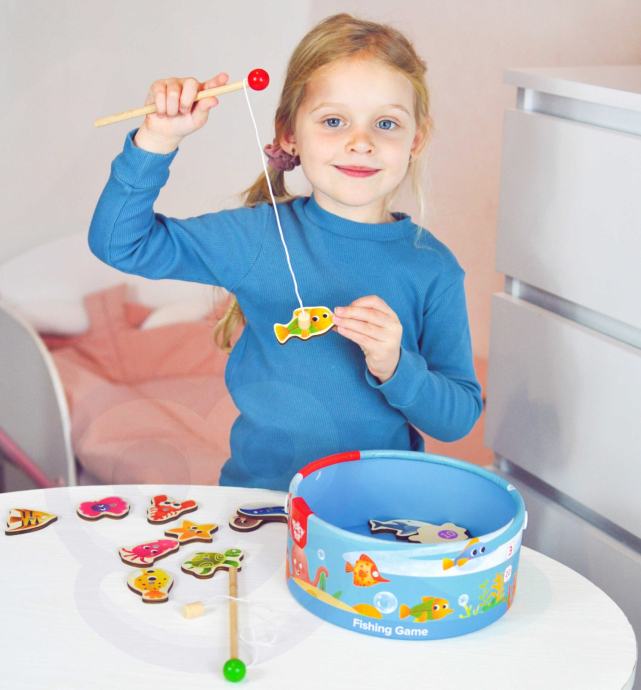 TOOKY TOY pecanje ribica, set koji se sastoji od 22 elementa sa slikama životinja i ugrađenim magnetima. Dva drvena štapa za pecanje i kanta koja imitira podvodni svijet pružit će duge sate zabave. Igra dopušta ne samo jednoj osobi da igra, već i grupi nitkova. Cijeli je izrađen od lakiranog drva i obojan netoksičnim bojama u živim bojama koje će zadovoljiti svakog korisnika i pružiti puno zabave. Igra vježba motoričku koordinaciju i podržava odnos ruka-oko , te uči strpljenju i koncentraciji. Zgrabite štapove za pecanje i vrijeme je da počnete loviti!