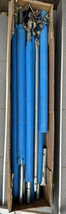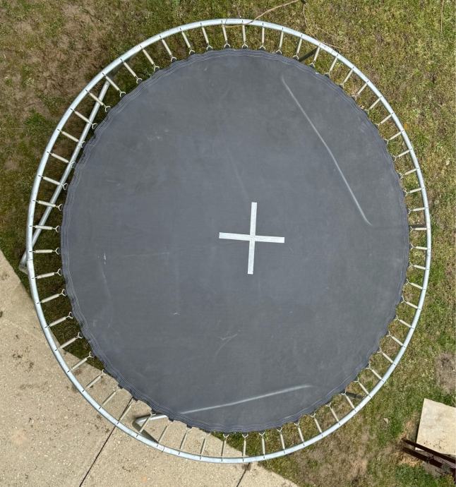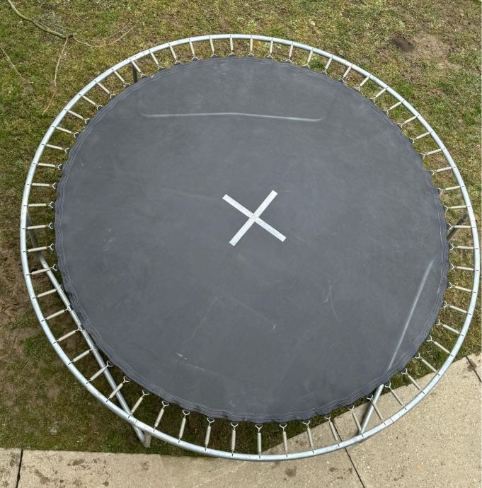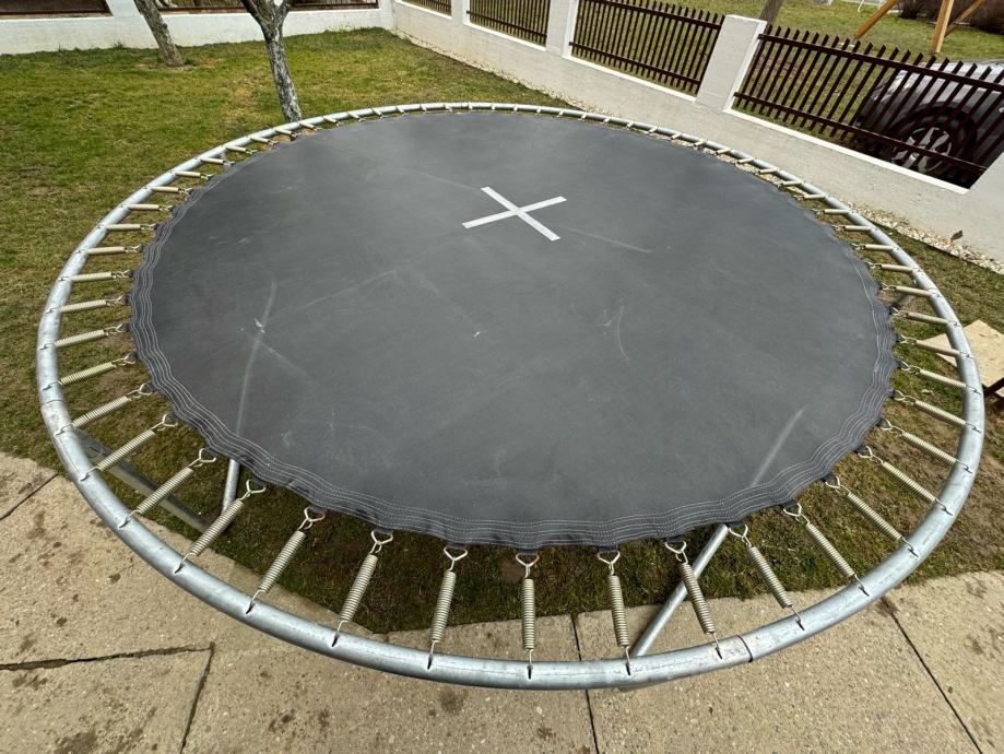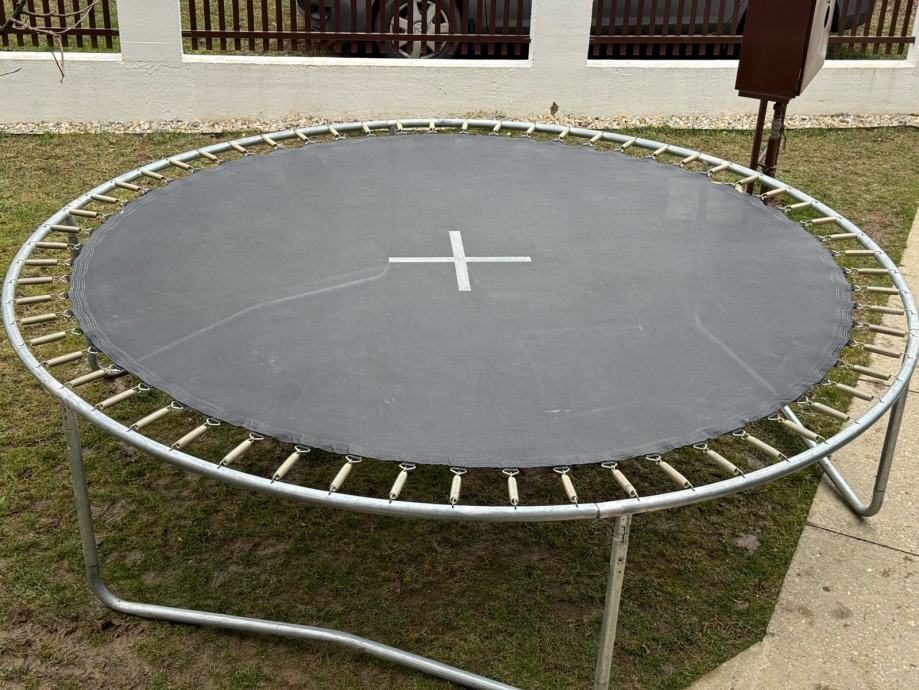 Trampolin 305 cm promjera, bez zaštitne folije za opruge, sa zaštitnom ogradom/mrežom na kojoj je oštećen jedan aluminijski stupić.