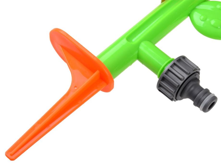 Igračka je u potpunosti izrađena od plastike u lijepim živim bojama, opremljena univerzalnim krajem za spajanje vrtnog crijeva. Igračka ima vrh za zabijanje u travnjak.