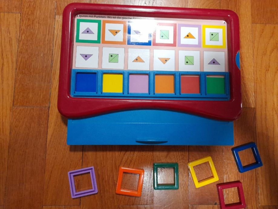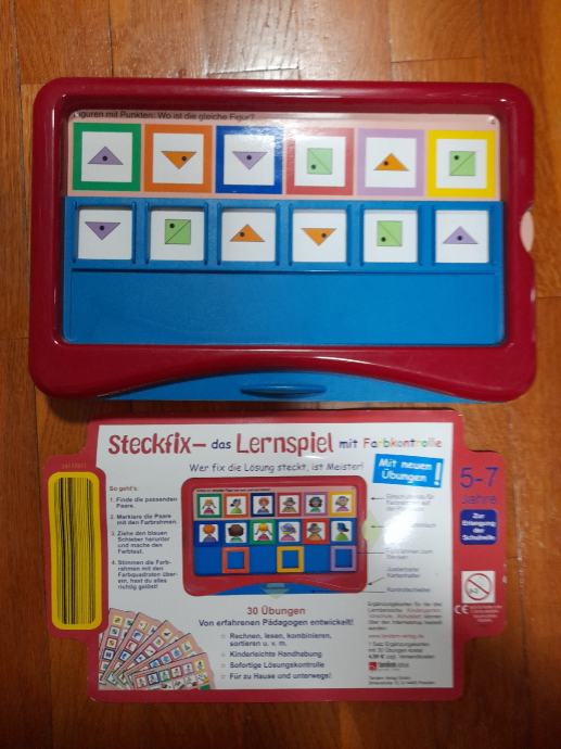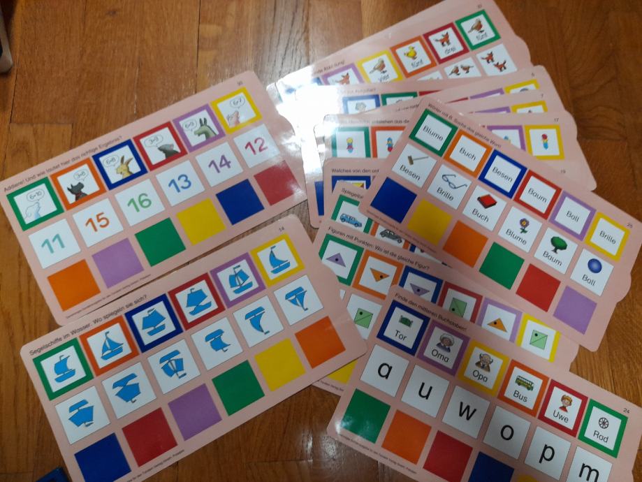 30 kartica s raznim pitanjima/zadacima na njemackom jeziku, odgovara se s pomocu sarenih okvira uz samokontrolu. Jako zgodno za vjezbanje raznih vjestina u predskolskoj dobi. Dosta koristeno ali citavo