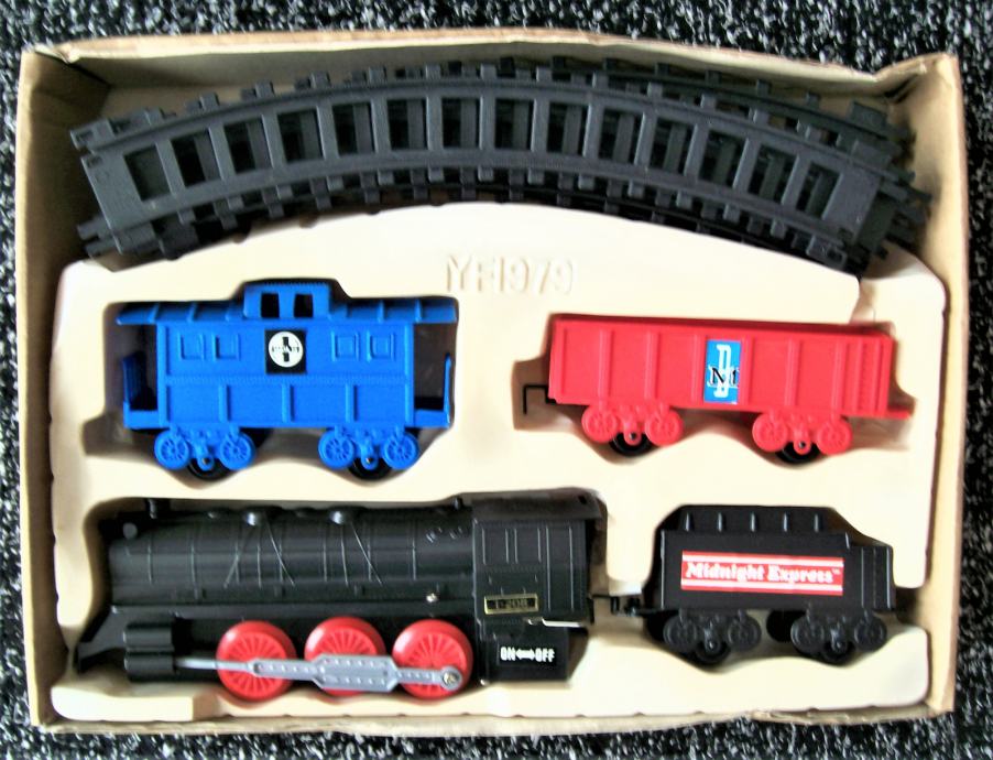 Set sadrži lokomotivu, 3 vagona i tračnice. Lokomotiva za pogon koristi 2 AA baterije koje nisu uključene. Dimenzije pakiranja: 68,6 x 7,9 x 43,2 cm.