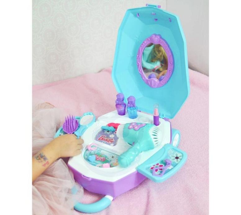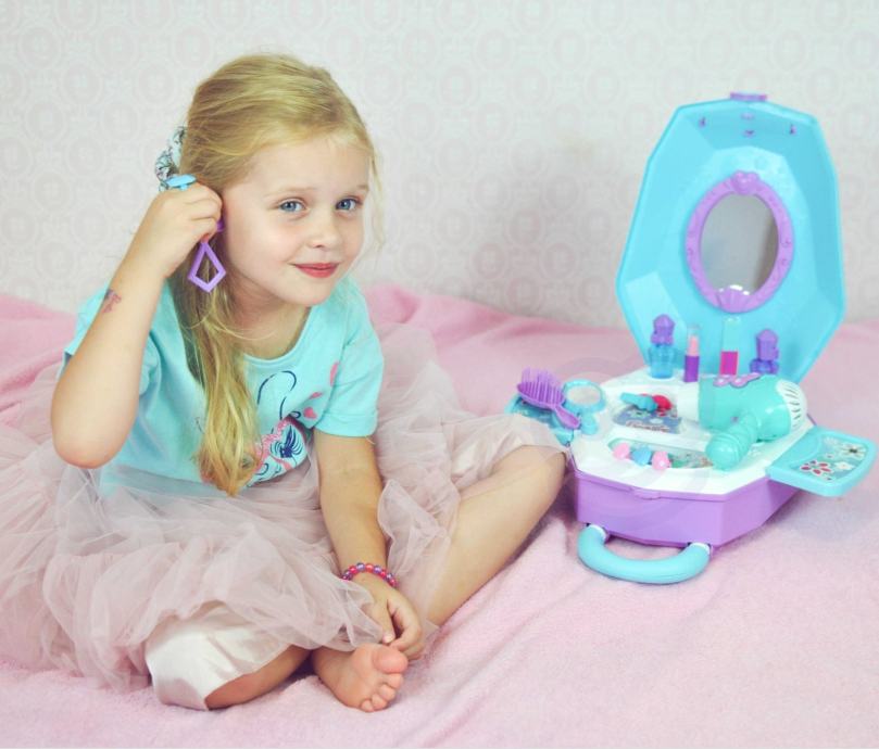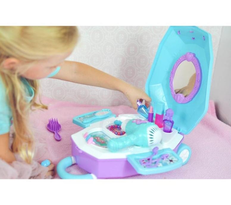 2u1 Beauty Salon toaletni stolić za djevojčice u koferu marke WOOPIE savršen je prijedlog za sve male princeze. Zahvaljujući ovom kompletu vaše se dijete može osjećati kao prava princeza i ima sve za pripremu za veliki bal ili večernji izlazak s prijateljima. Unutar kofera nalazi se ogledalo i toaletni stolić na rasklapanje . Osim dodataka kao što su ogledalo , kopče za kosu i četka , u setu se nalazi i sušilica na baterije koja radi kao prava - puše zrak . Kozmetika i ostali dodaci savršeno reproduciraju stvarne predmete, što će vam omogućiti da postanete mala princeza!