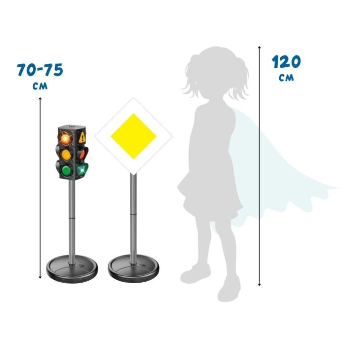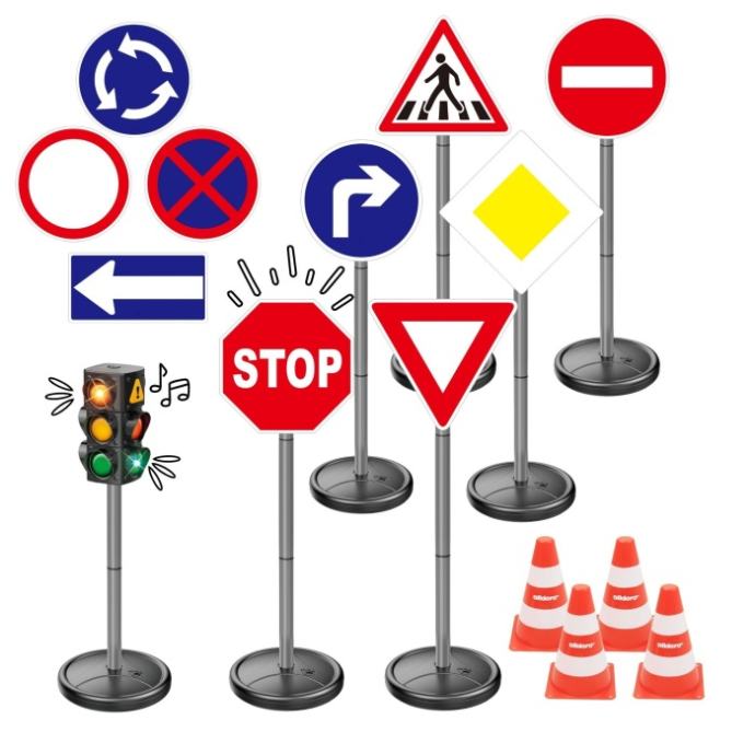 Naš XXL prometni komplet donosi prometnu školu ravno u vaš dom! S 70 cm visokim semaforom, 10 realističnih prometnih znakova visine 75 cm i 4 izdržljiva čunja, djeca na razigran način uče najvažnija prometna pravila. Izuzetno veliki komplet oduševljava realističnim izgledom i nudi sve što malim sudionicima u prometu treba za prve sigurne korake na cesti.