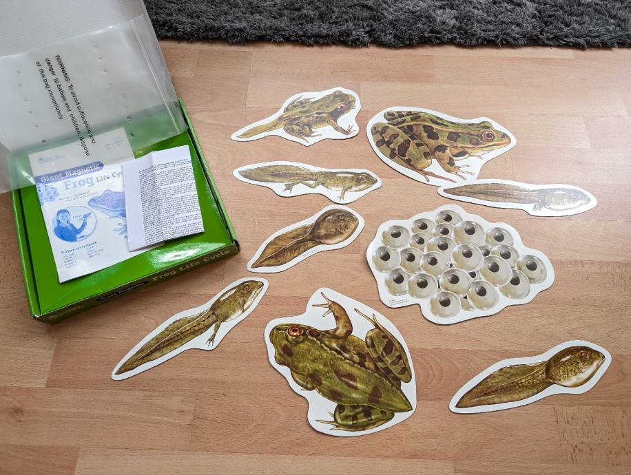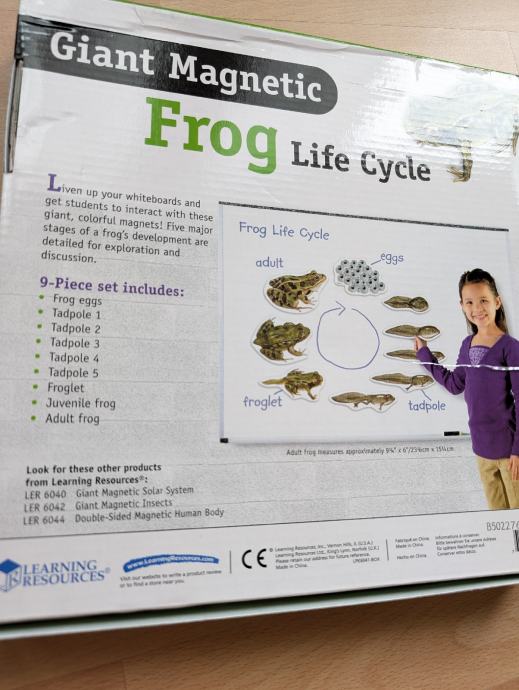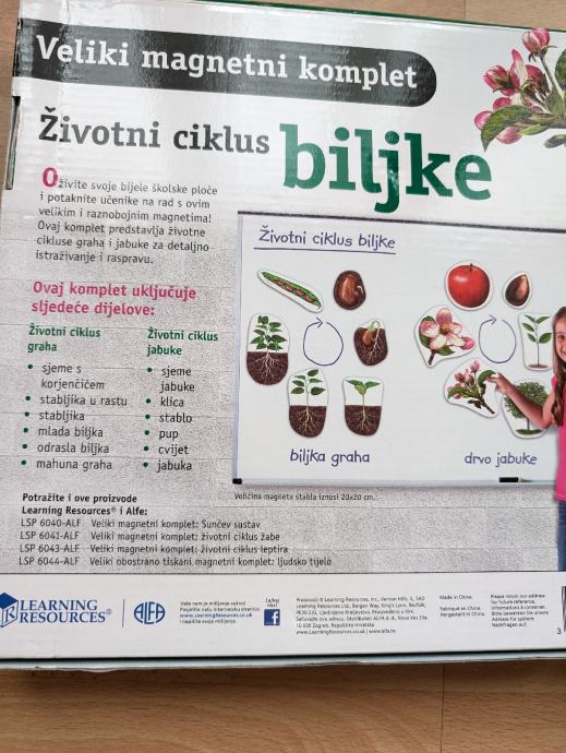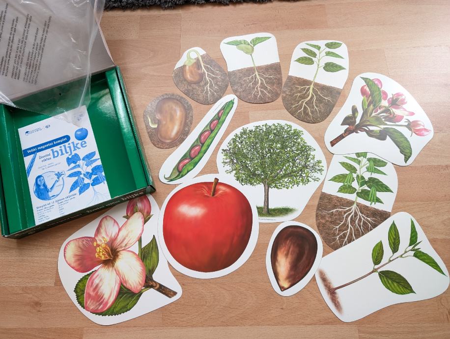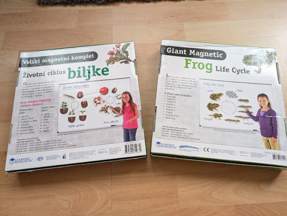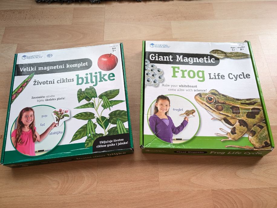 Životni ciklus biljke (jabuka i grah) i životni ciklus žabe, dva kompleta sa šarenim magnetima, svaki edukativni set sadrži upute na hrvatskom jeziku.