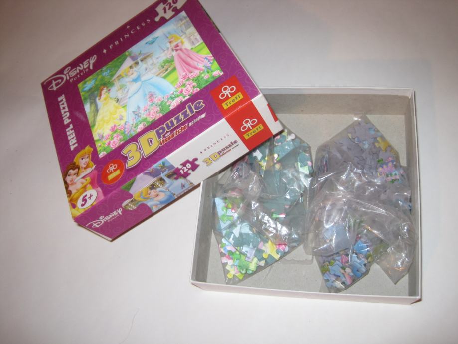 Prodajem Disney 3D puzzle sa motivom Disney princeza. Sadrži obične i 3D puzzle-svake po 120 komada.Dimenzije 25x20 cm. Za djecu iznad 5 godina.