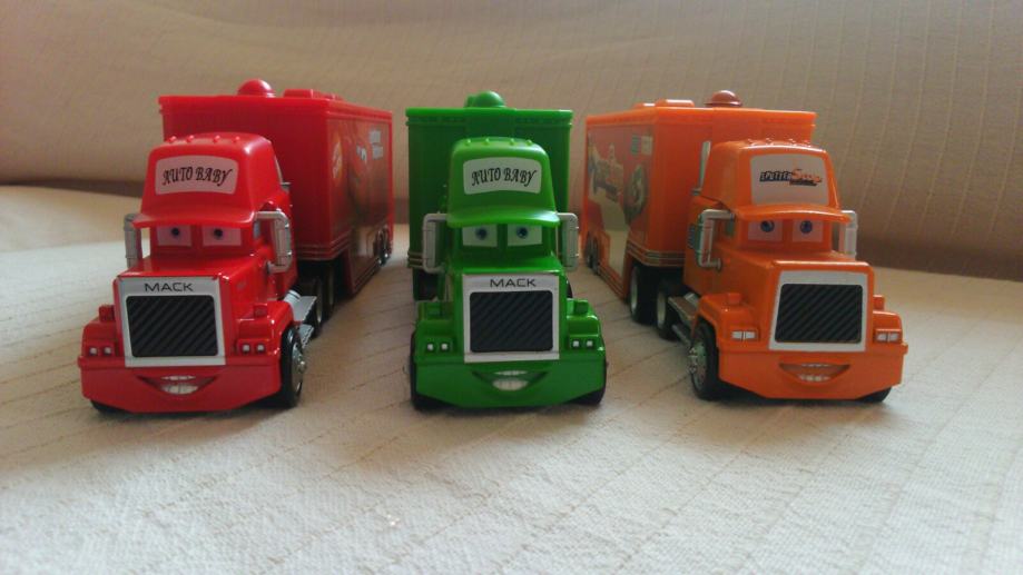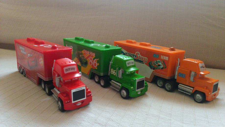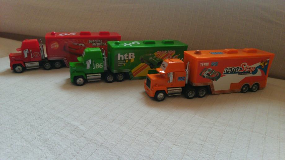 Kamioni iz crtica auti, kamion od Kinga Sika i Marija Kumpluga. Svaki zasebno po 100kn, zajedno sva tri 240kn. Odnosno 80.kn po komadu ako uzmete sva tri. U prikolicu stane standardni metalni autic, svi kotaci se vrte i prikolica se odvaja od kamiona. Kamion je metalni, a prikolica je plasticna. Nema vise crvenog kamiona Martina nego Plavi King kamion i ova dva Sik i Mario Kumplug.