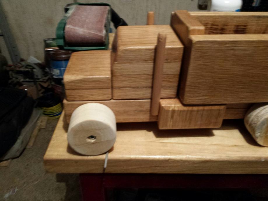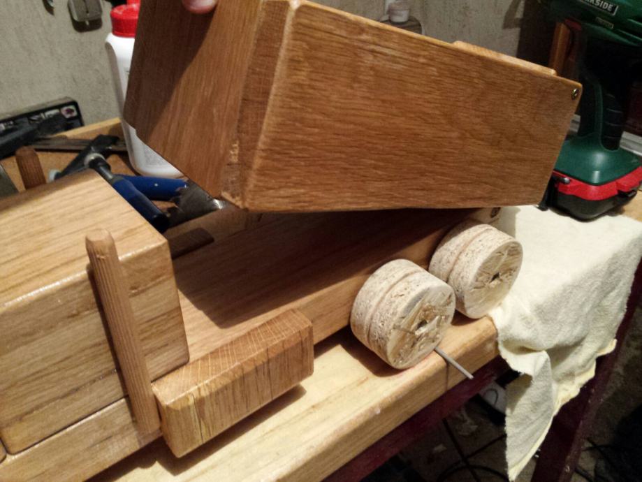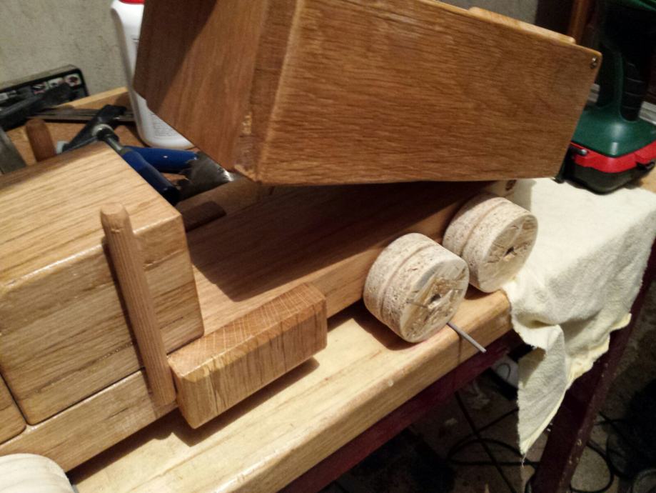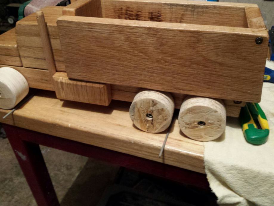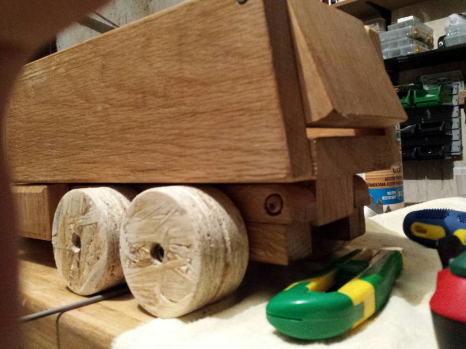drvena igracka kamion kiper od hrastovine prvi kotaci jelovine a zadnji osb ploce masivan