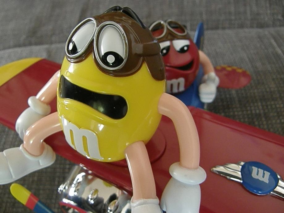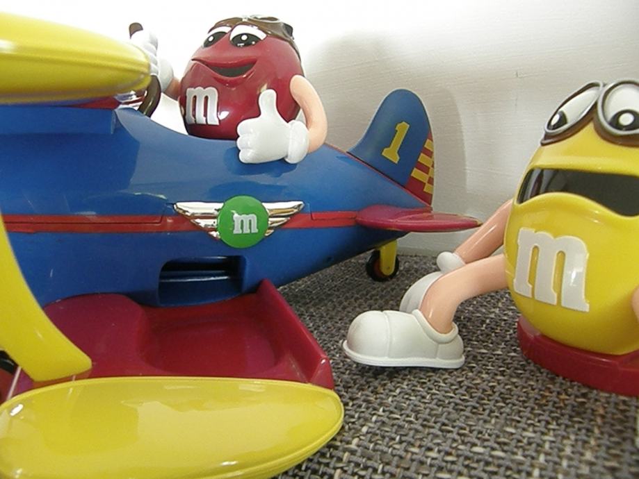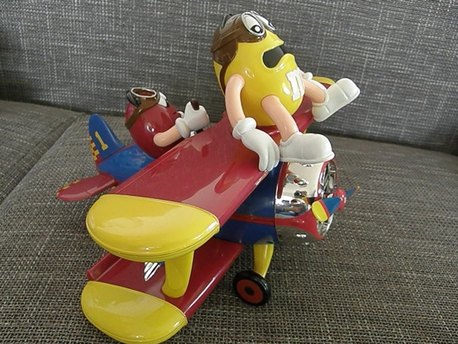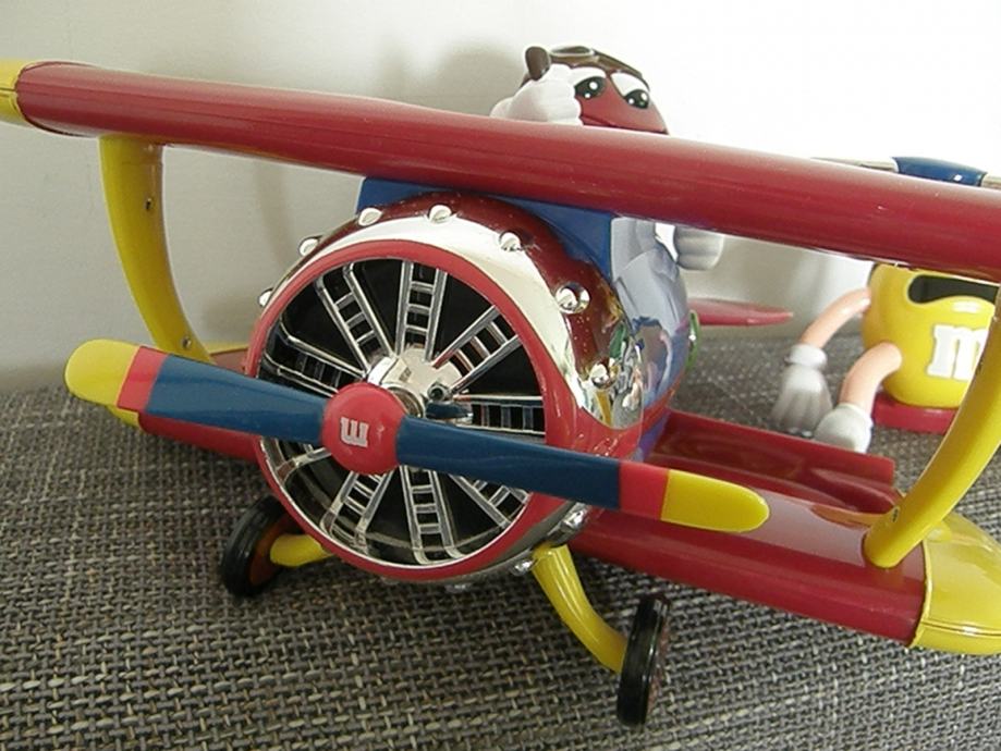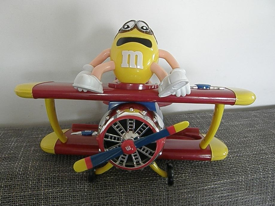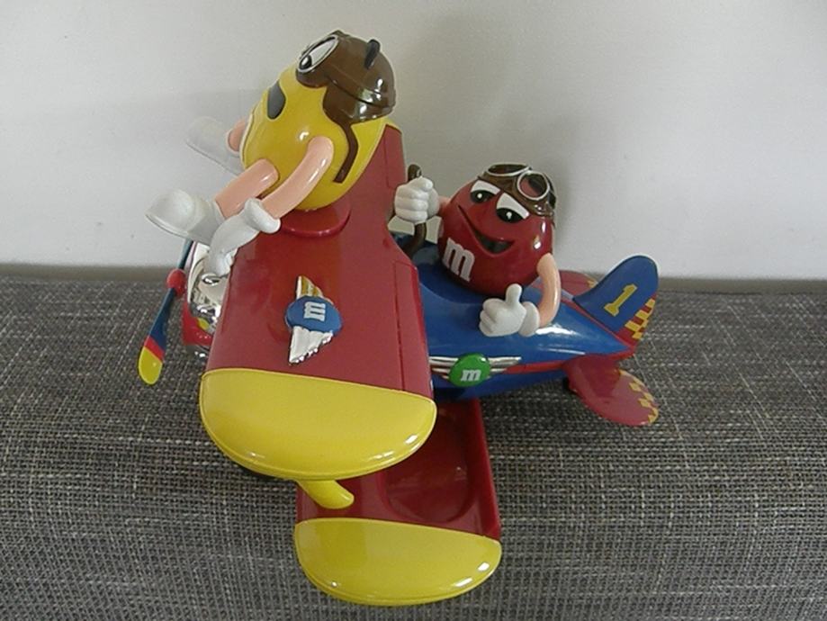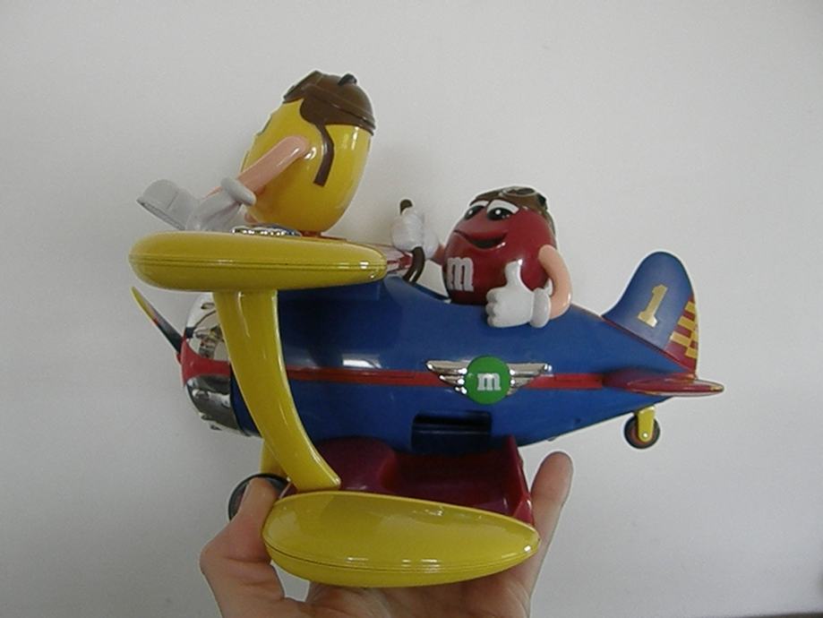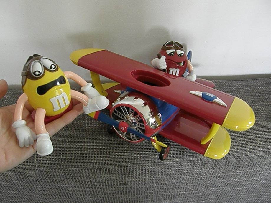 Ova igračka/spremište za M&M bombone je nova, samo jedan put su unutra bili bomboni za probu. Dijete mi nije bilo zainteresirano. Kad se propeler zavrti izlaze bomboni. Veliko je. Raspon krila je 30 cm. Napravljeno od jako čvrste, sjajne plastike.