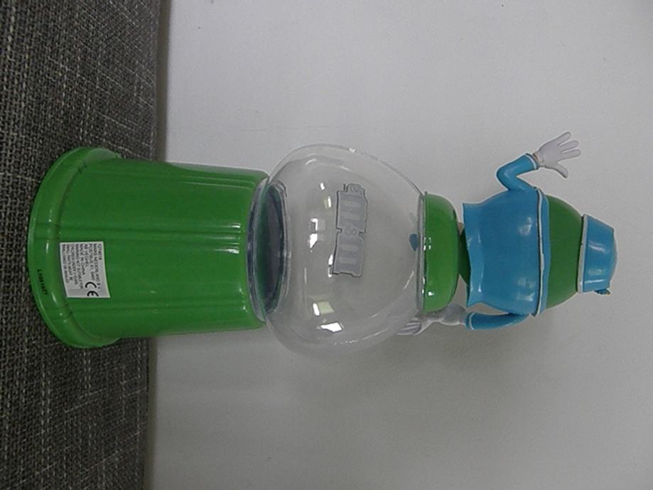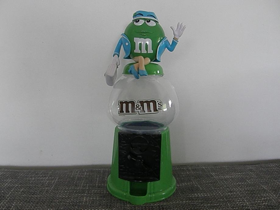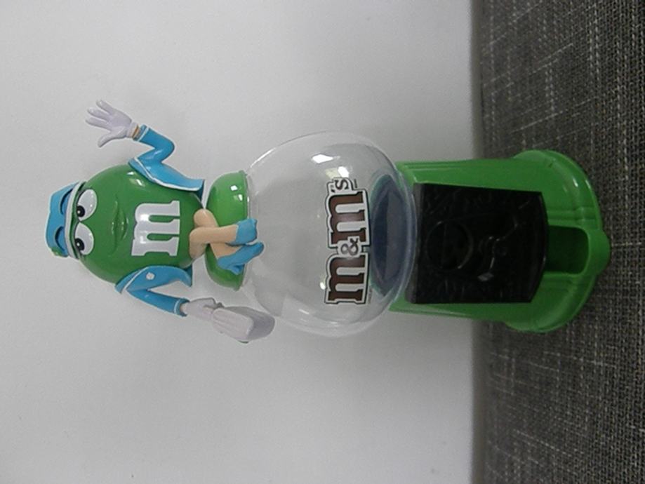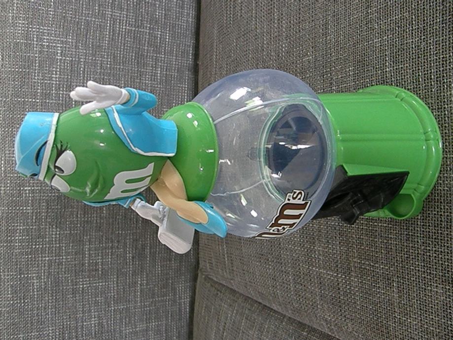 Stvar je kao nova jer su samo jednom unutra bili M&M bomboni. Kao novo je, neoštećeno. Unutra se stave M&M bomboni ili neki slični. Nakon što se zavrti jedan dio bomboni ispadaju. Visina je 30 cm.